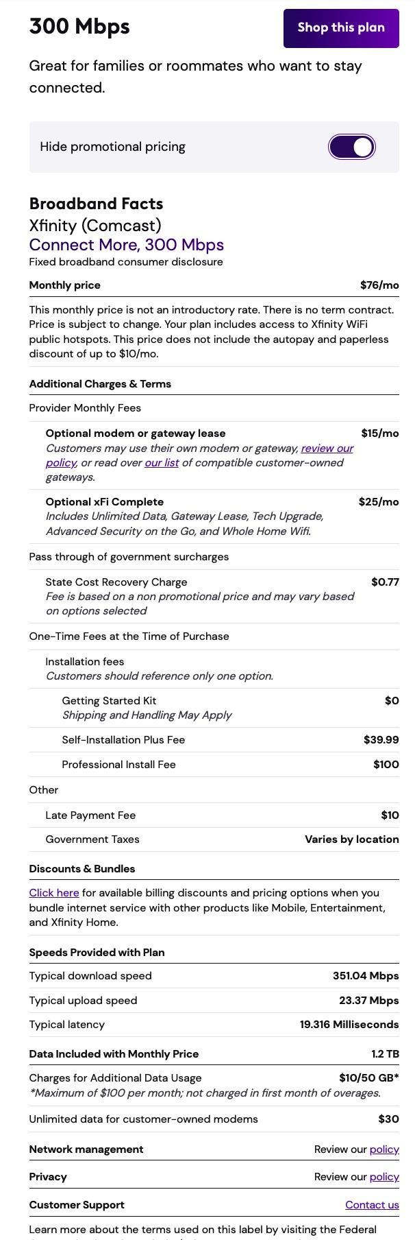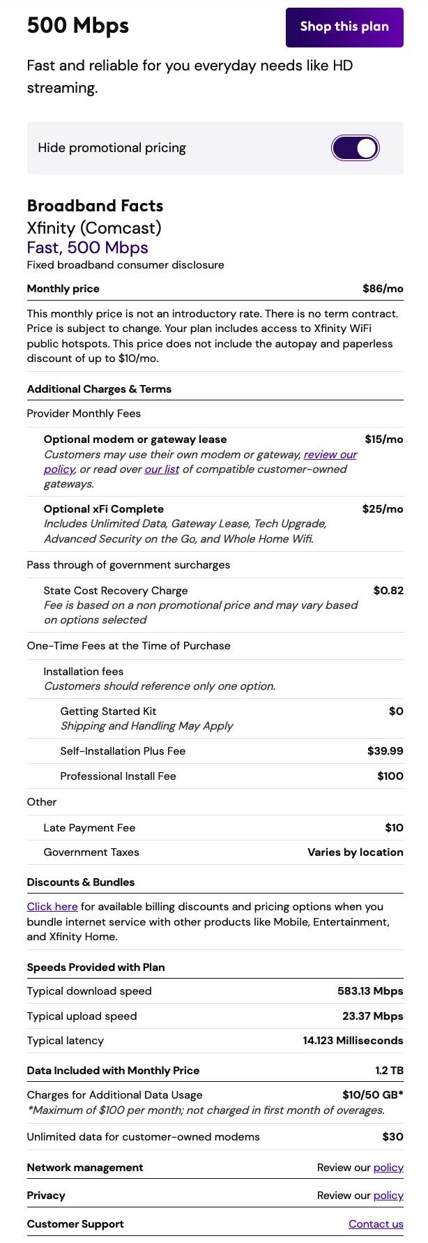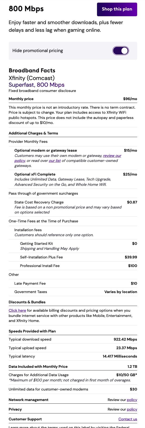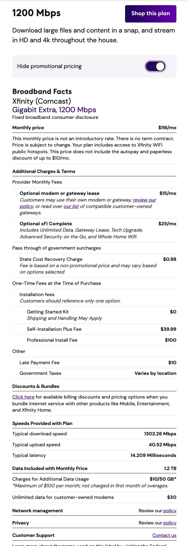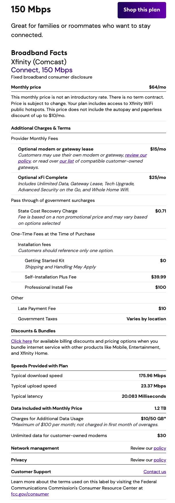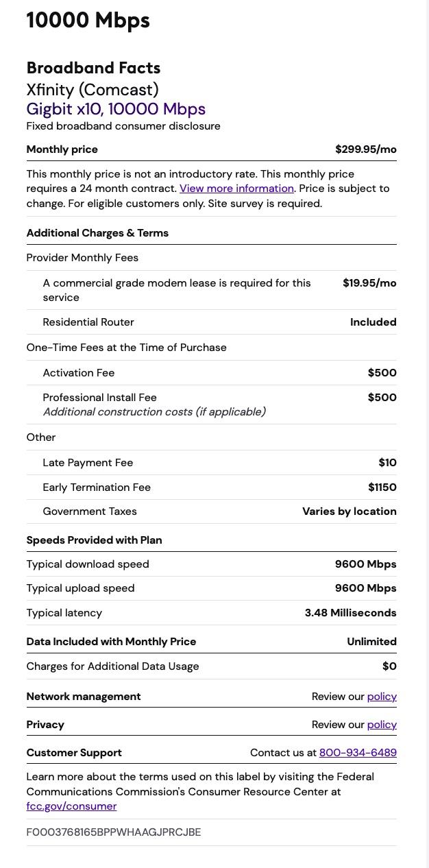 Broadband Facts Labels for Xfinity/Comcast in the Houston Area