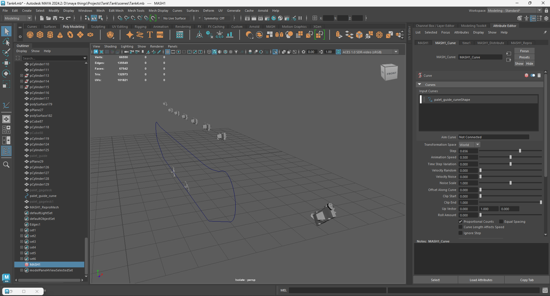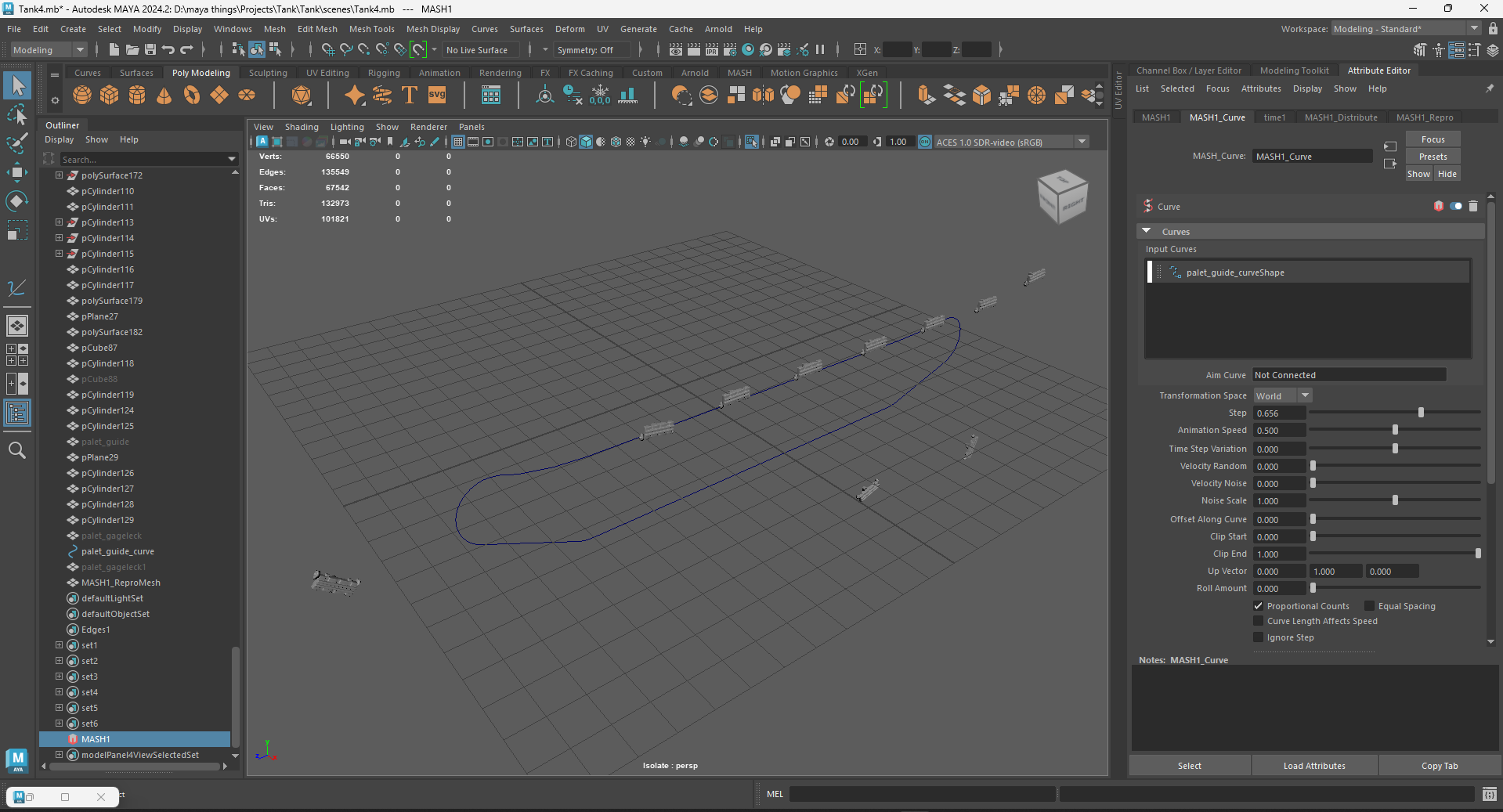 Curve node in mash is not working properly. I want that object to follow the path of the curve but it's not working, its outside of it and not the same size. The curve is attached and it's a whole, i tried detaching it but it didn't work neither (i used curve point and Curve->Detach method)