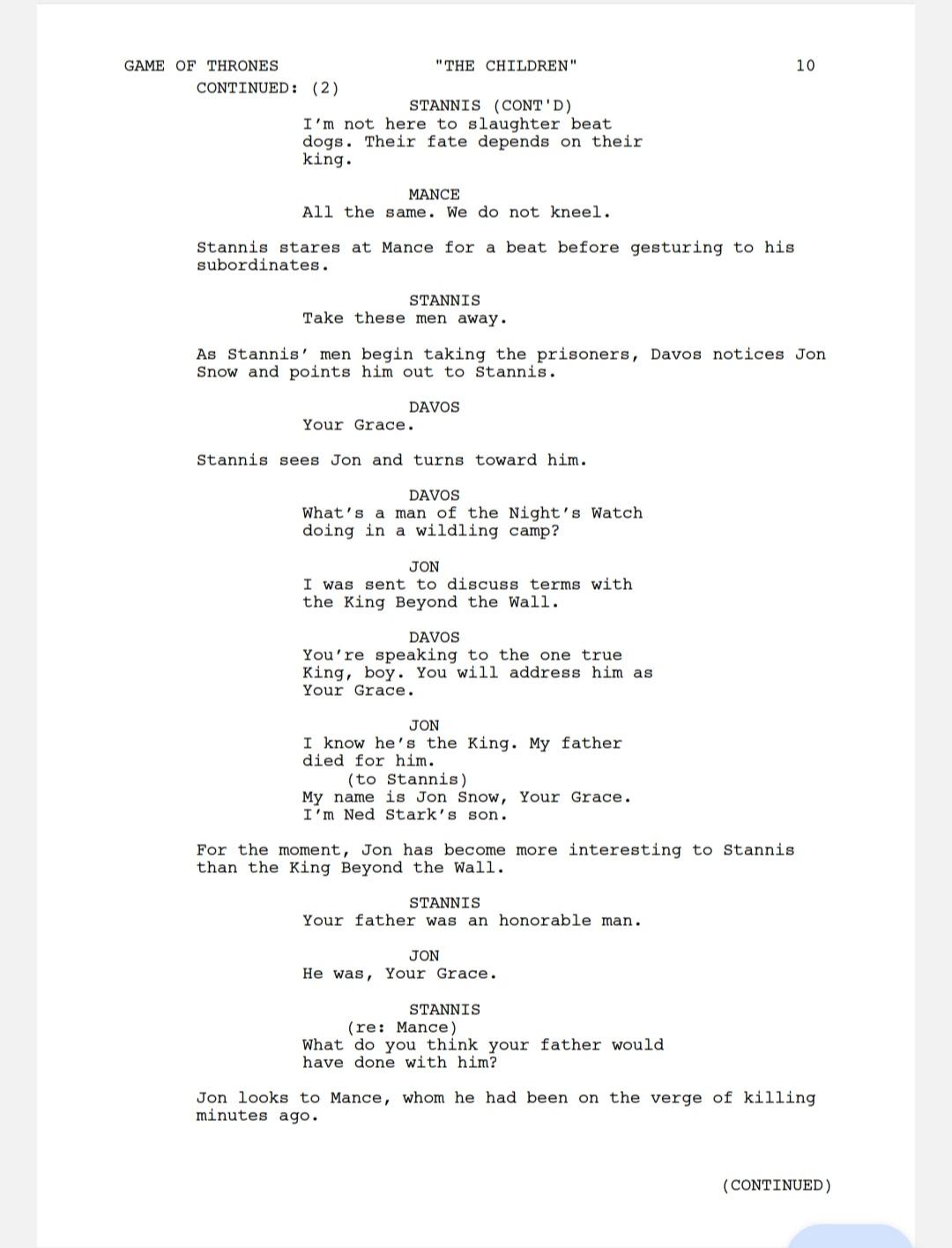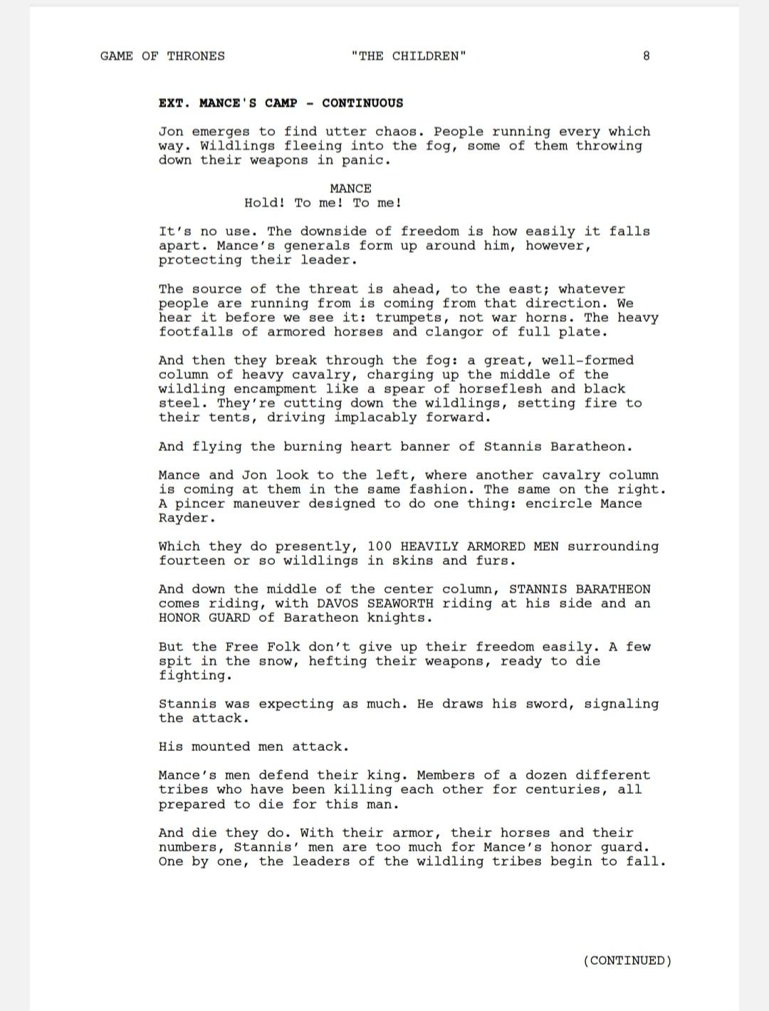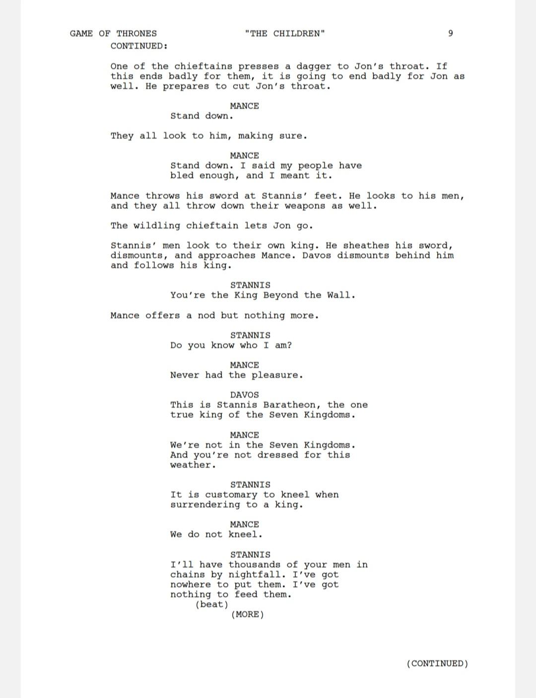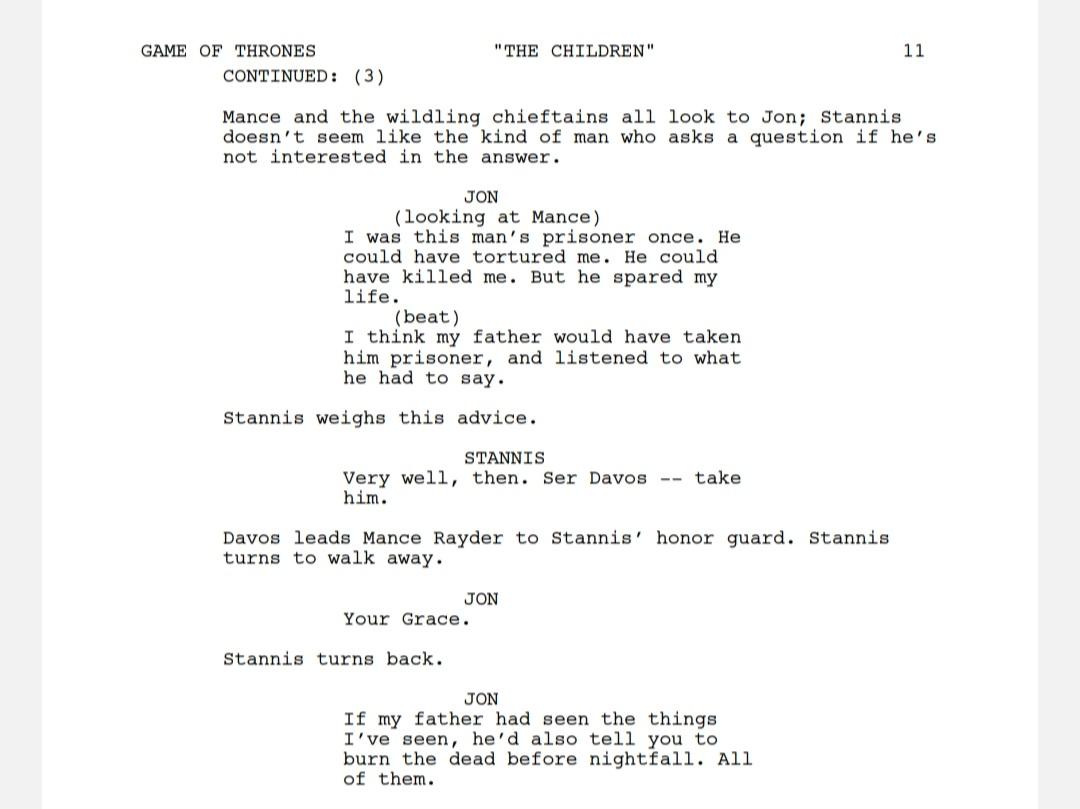 Excerpt from the script of the episode "The Children": Stannis arrives at the Wall.