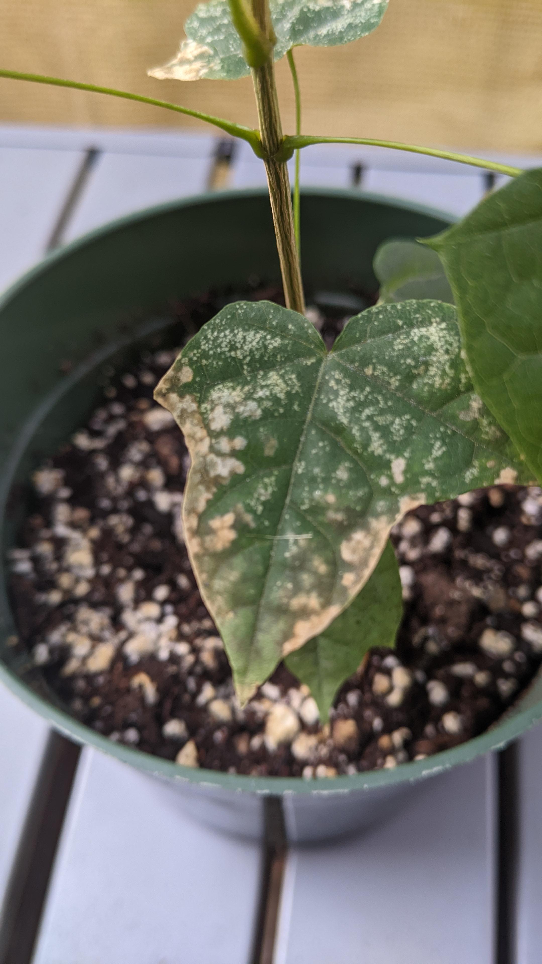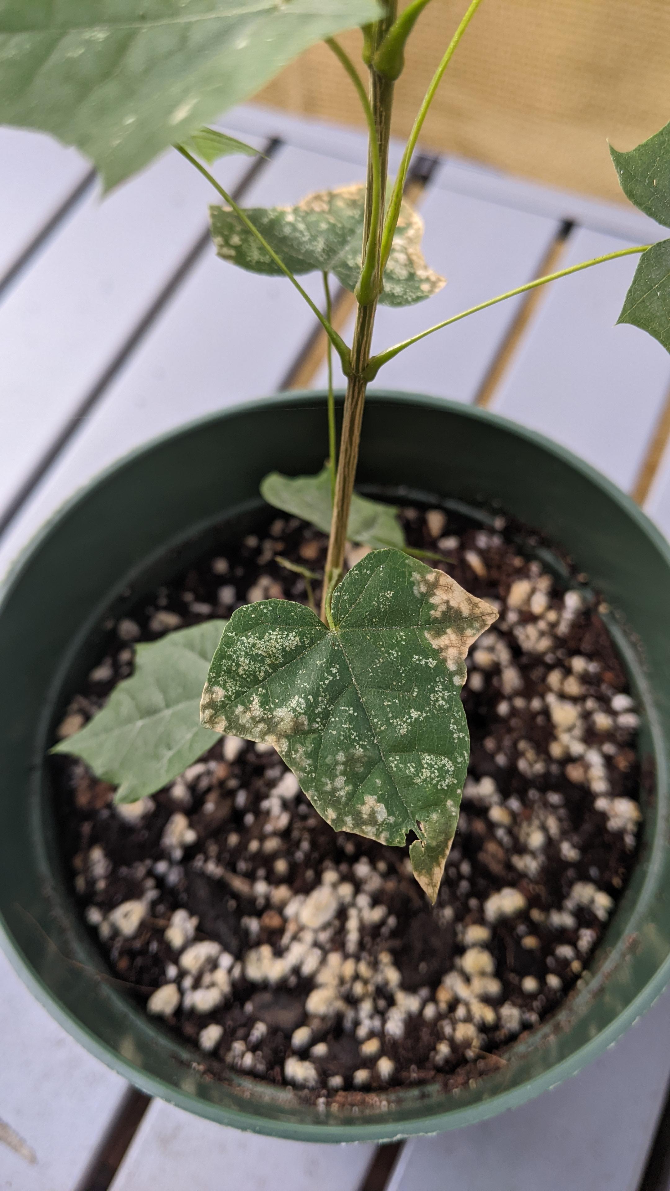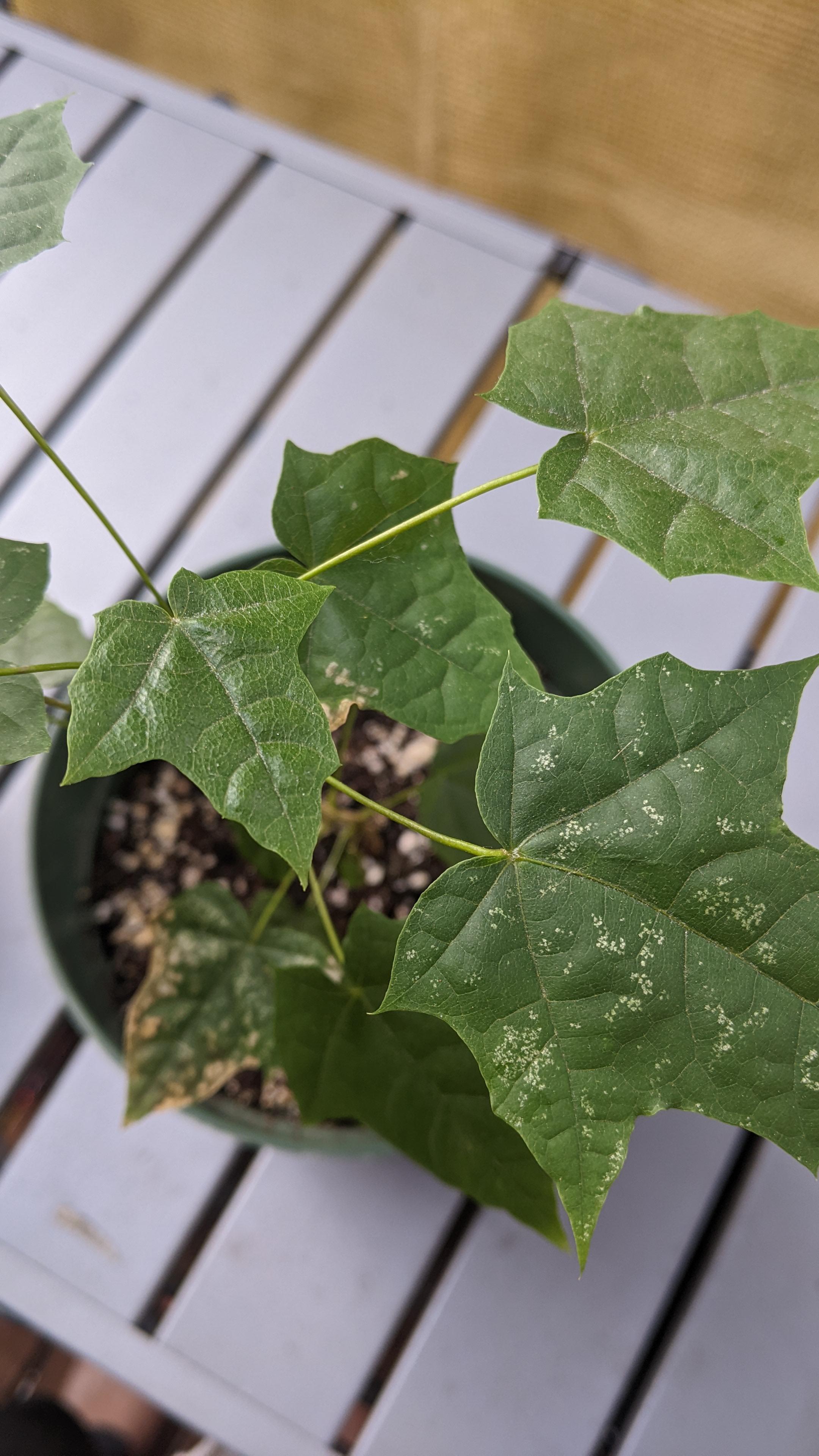 Growing maple trees in pots from seed. What is happening to the leaves?