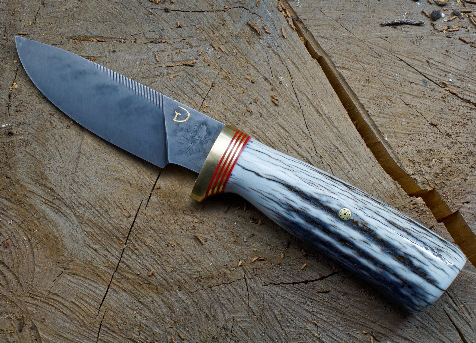 Here's a basic hunting knife. Nicholson file blade with Elk antler. Brass guard with red spacers. I like the old timey look so I dip it in ferric and it usually looks old lol