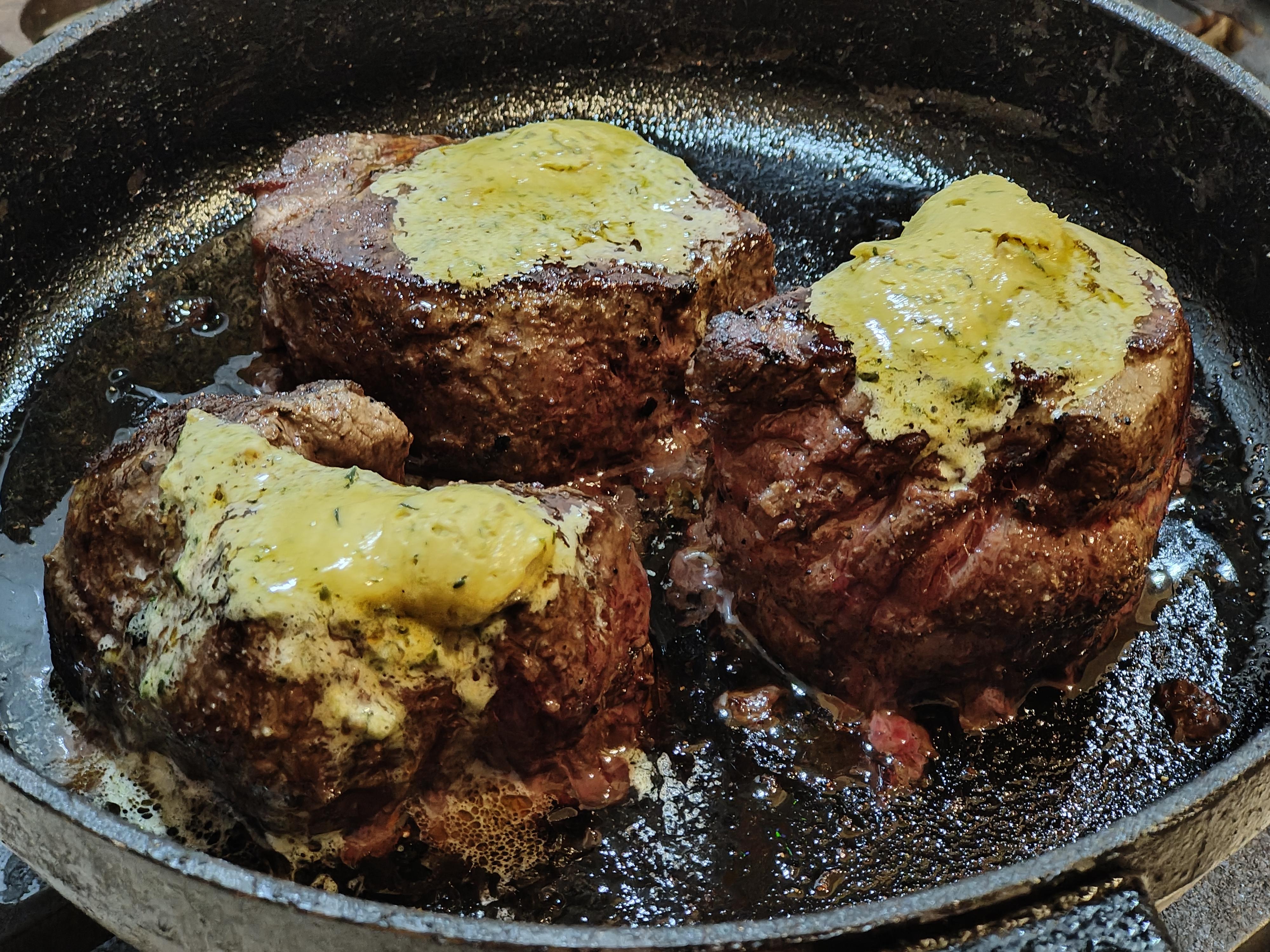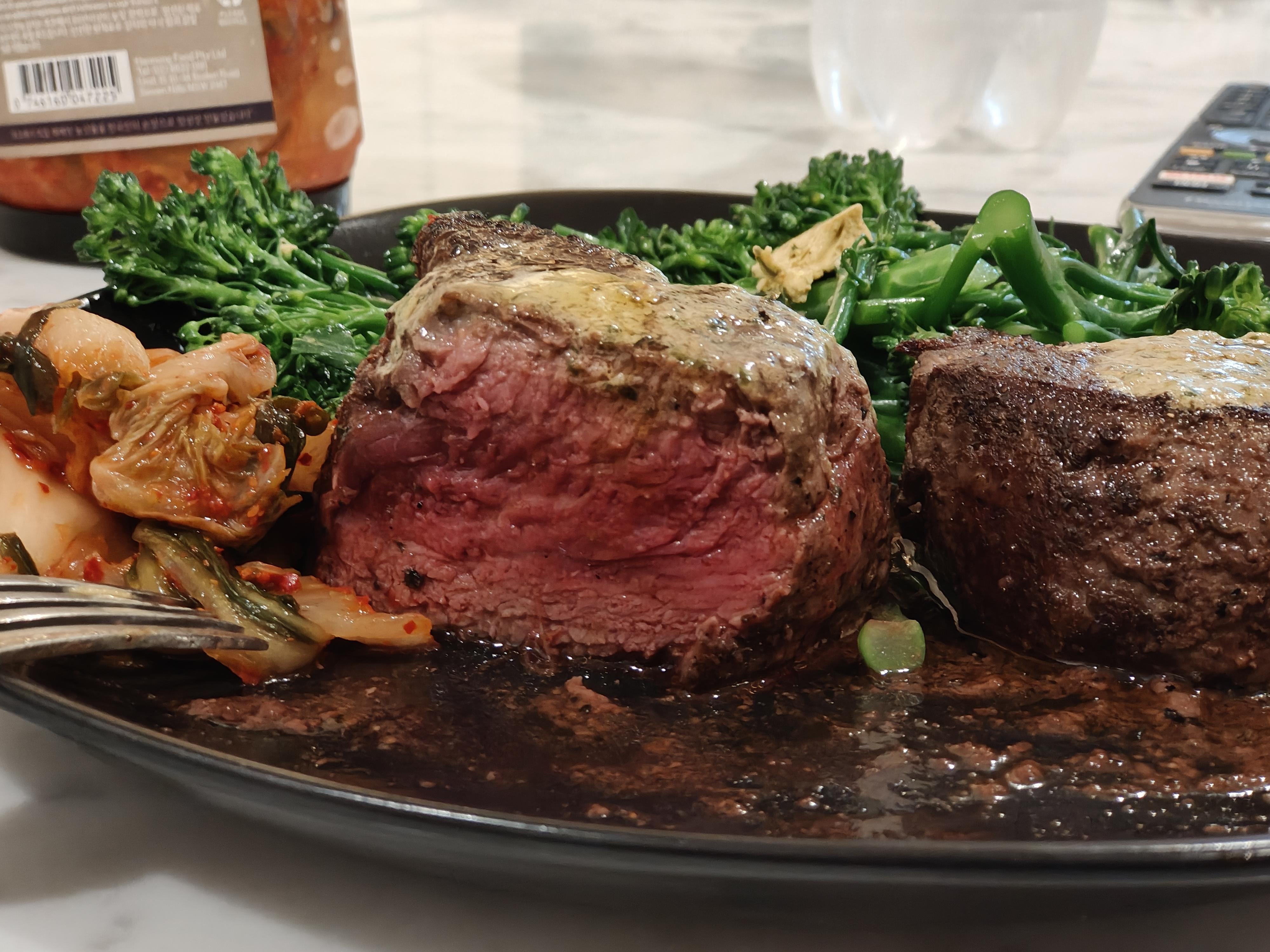 [homemade] Eye fillet steak cooked medium rare with Cafe de Paris butter, garlic broccolini and Kimchi.