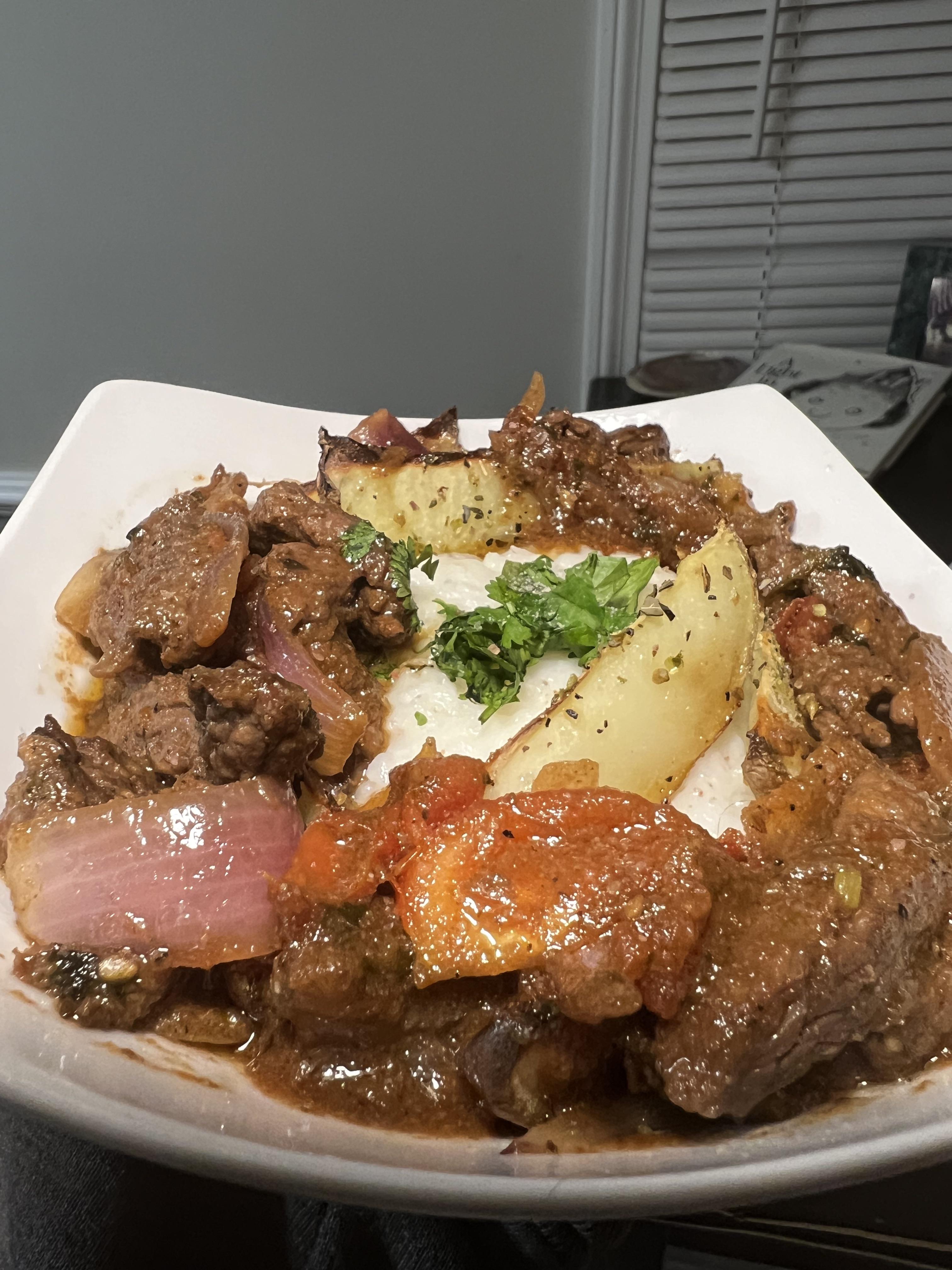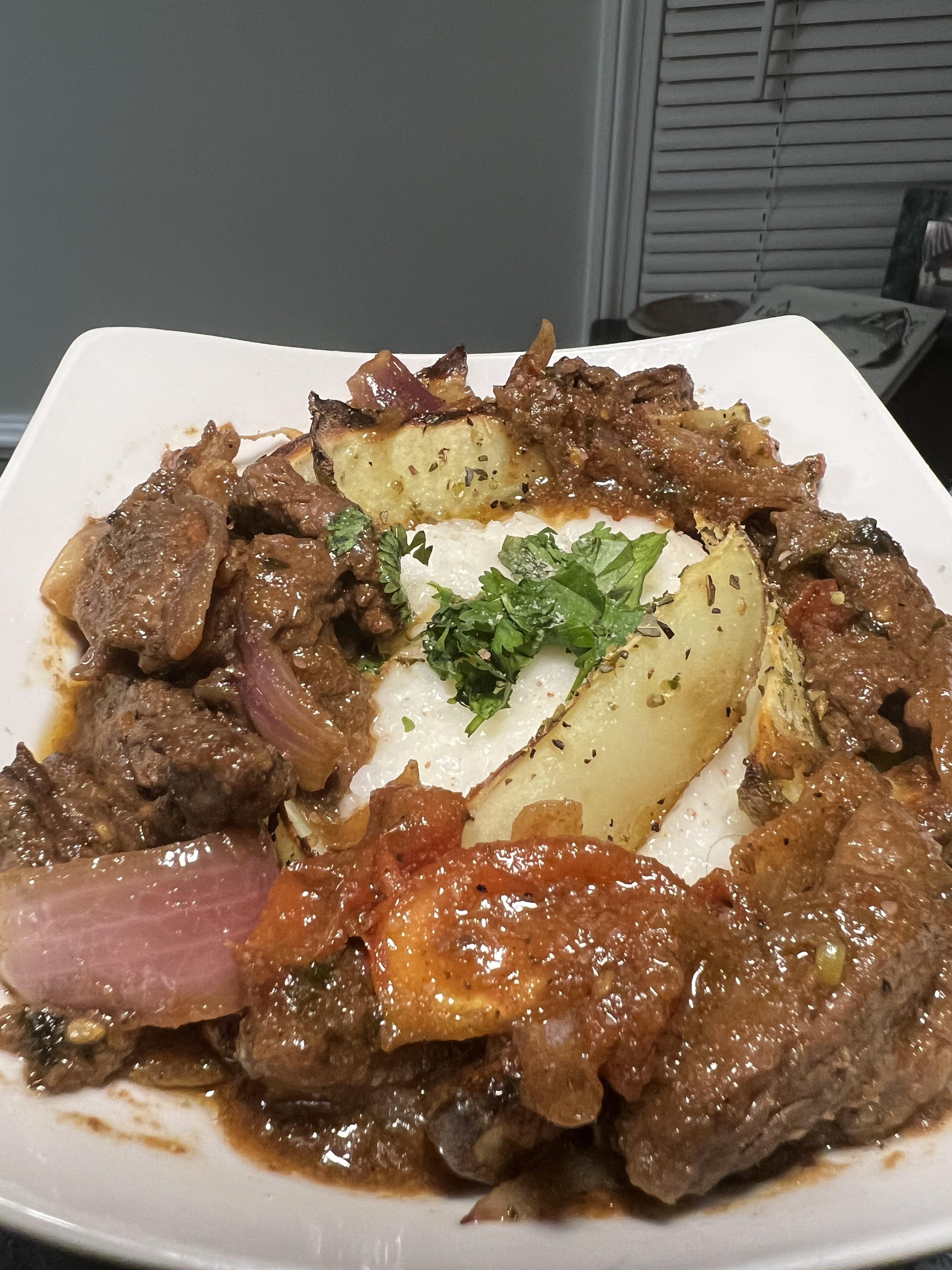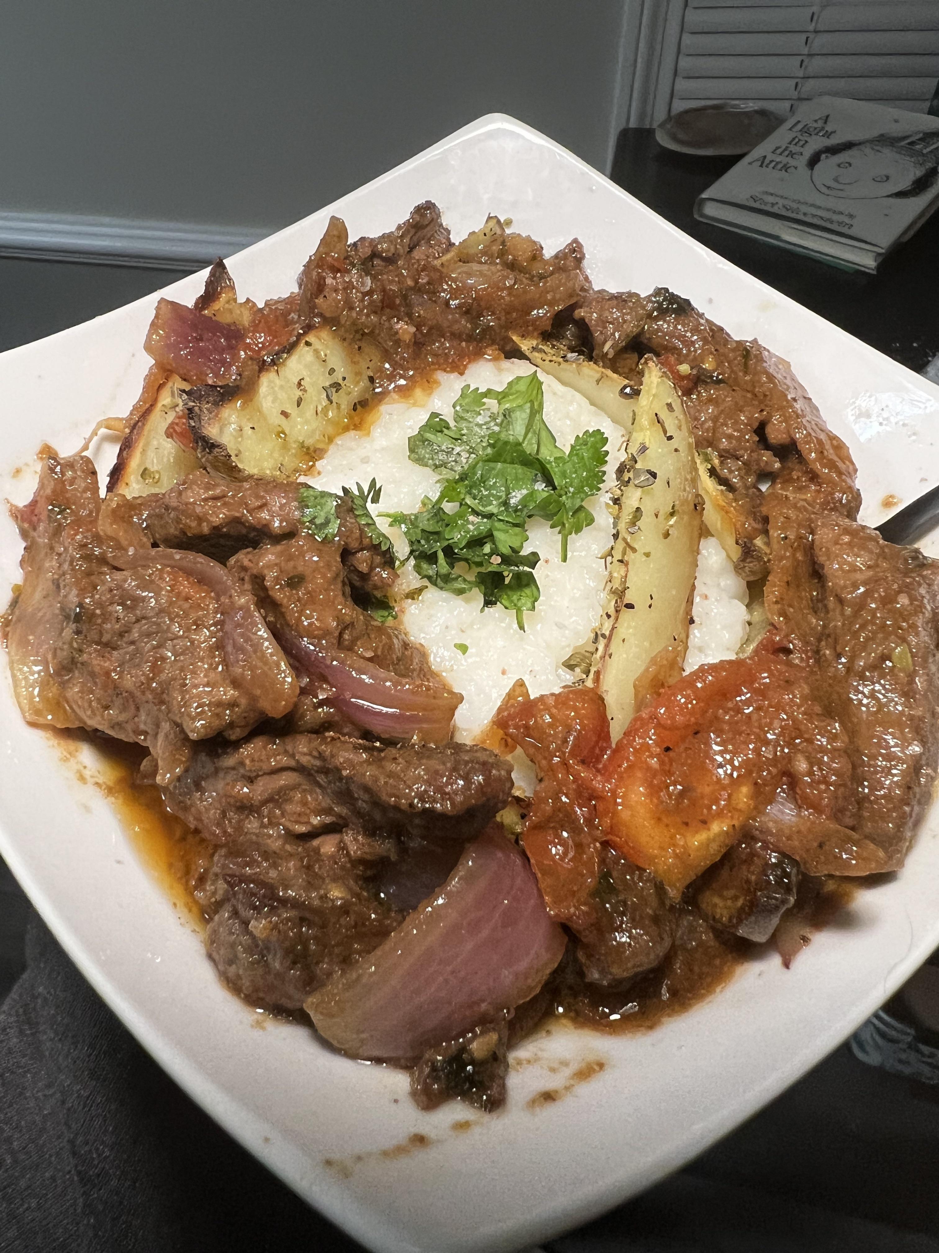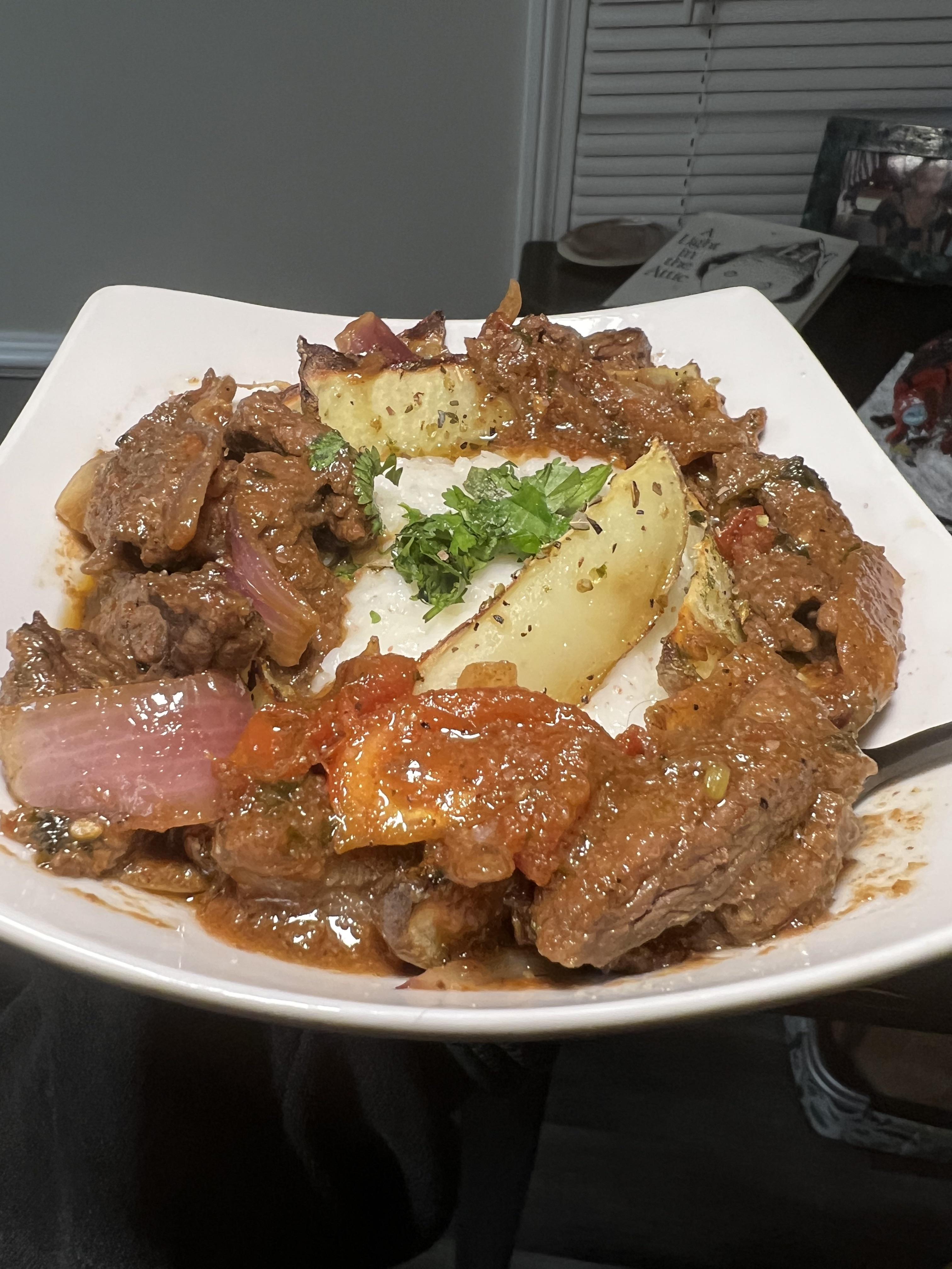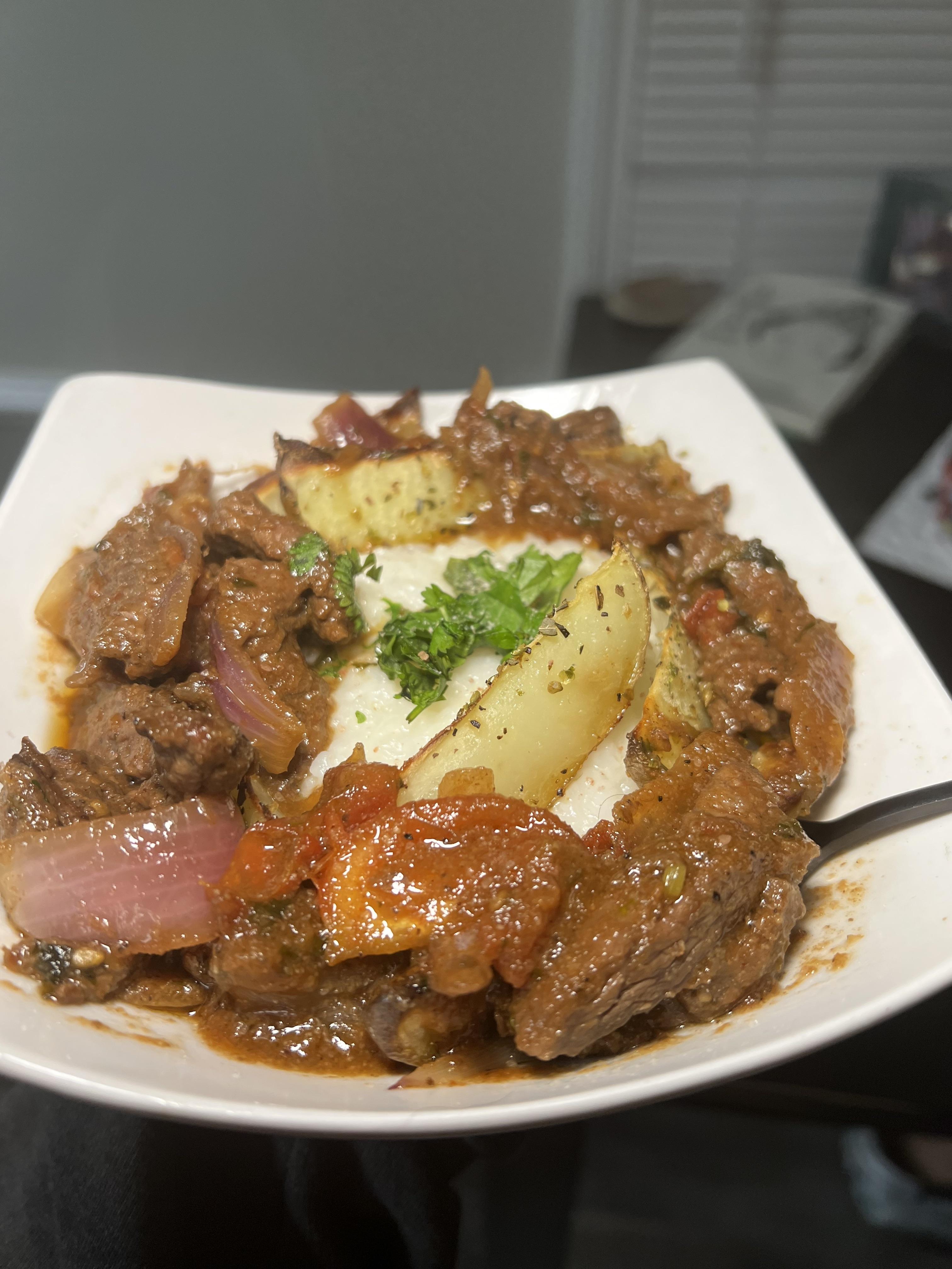 [Homemade] Peruvian-Style Lomo Saltado Steak, Seasoned Potato Wedges & Rice