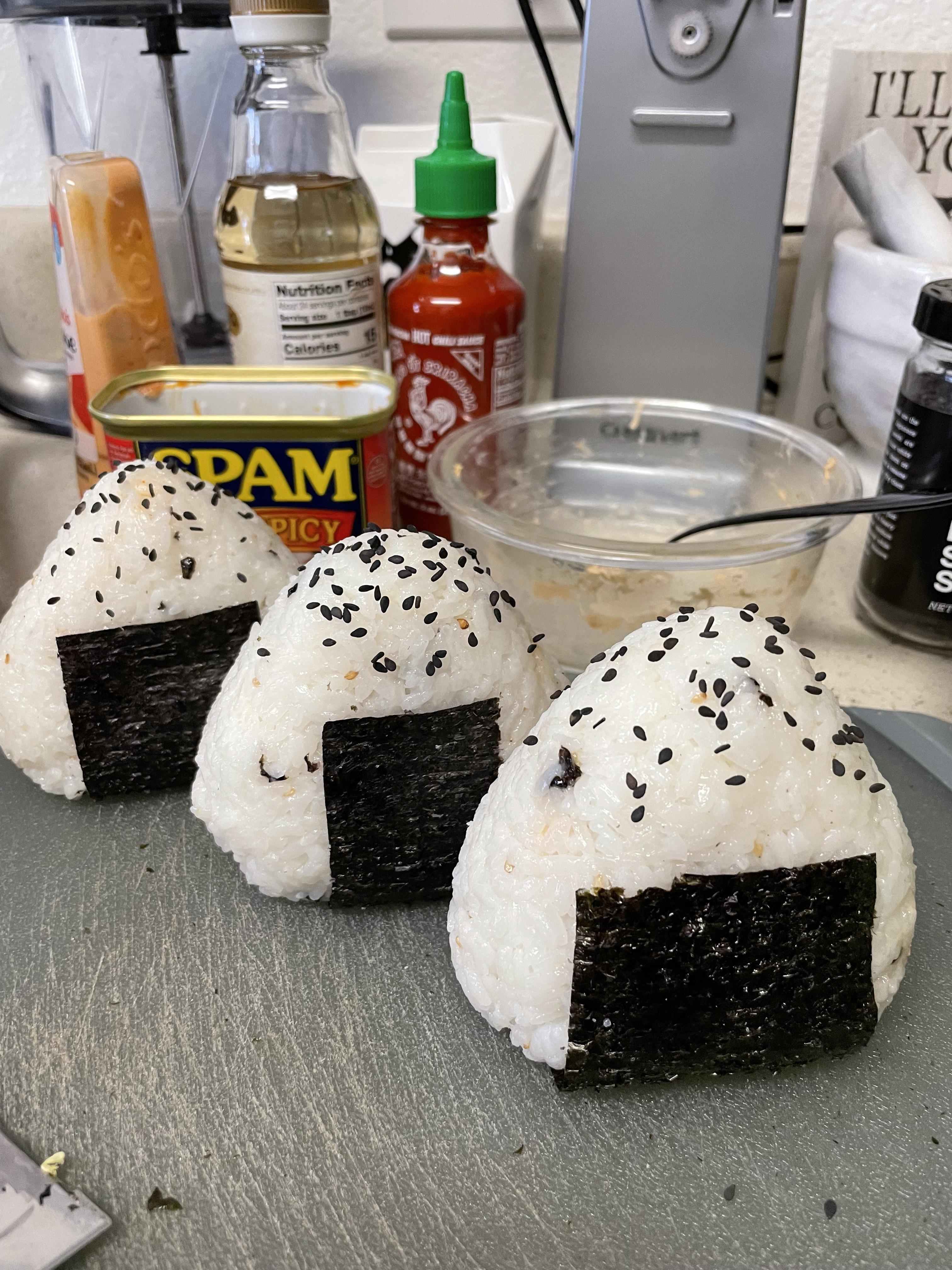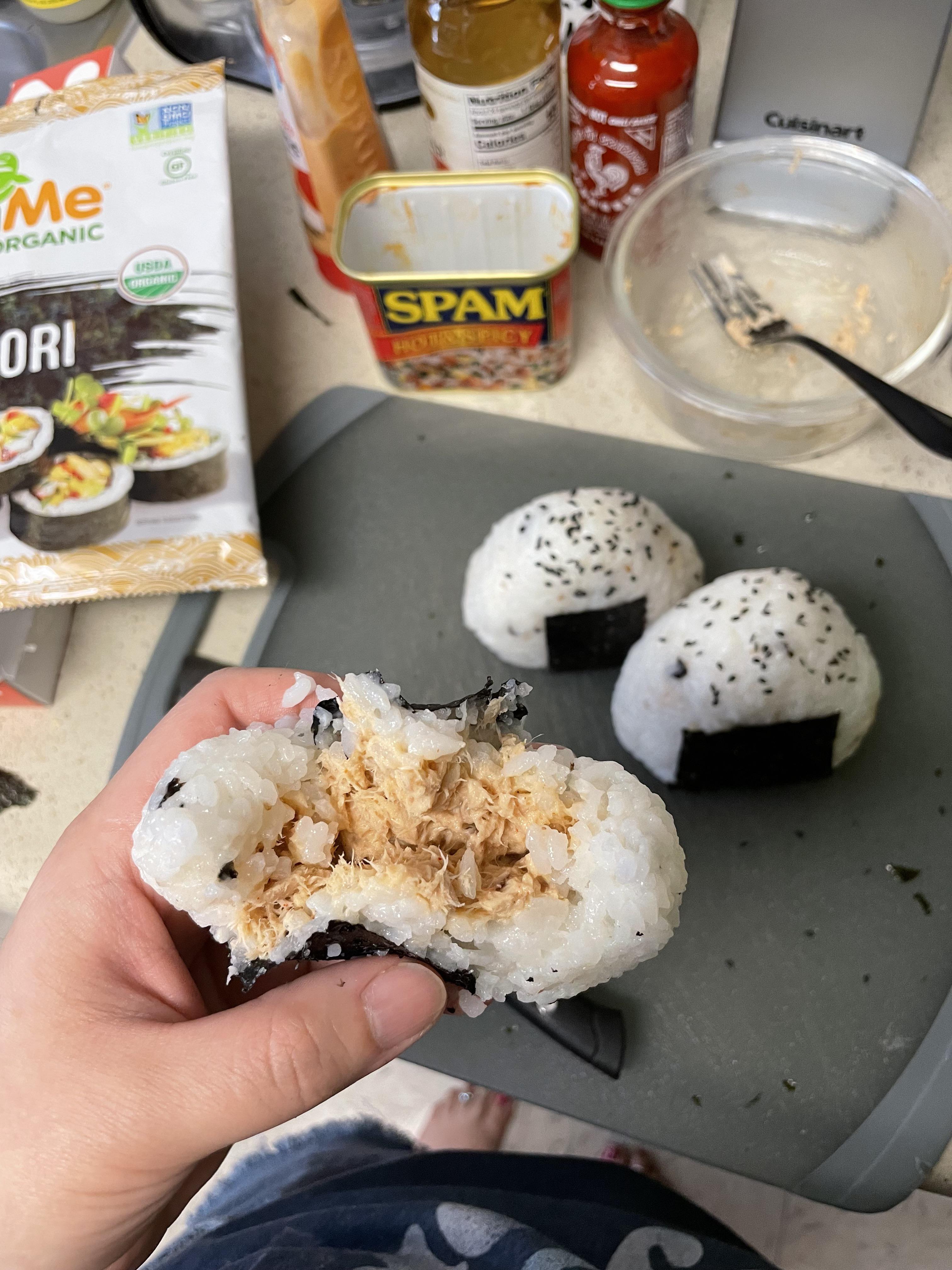 [homemade] spicy tuna & spam onigiri