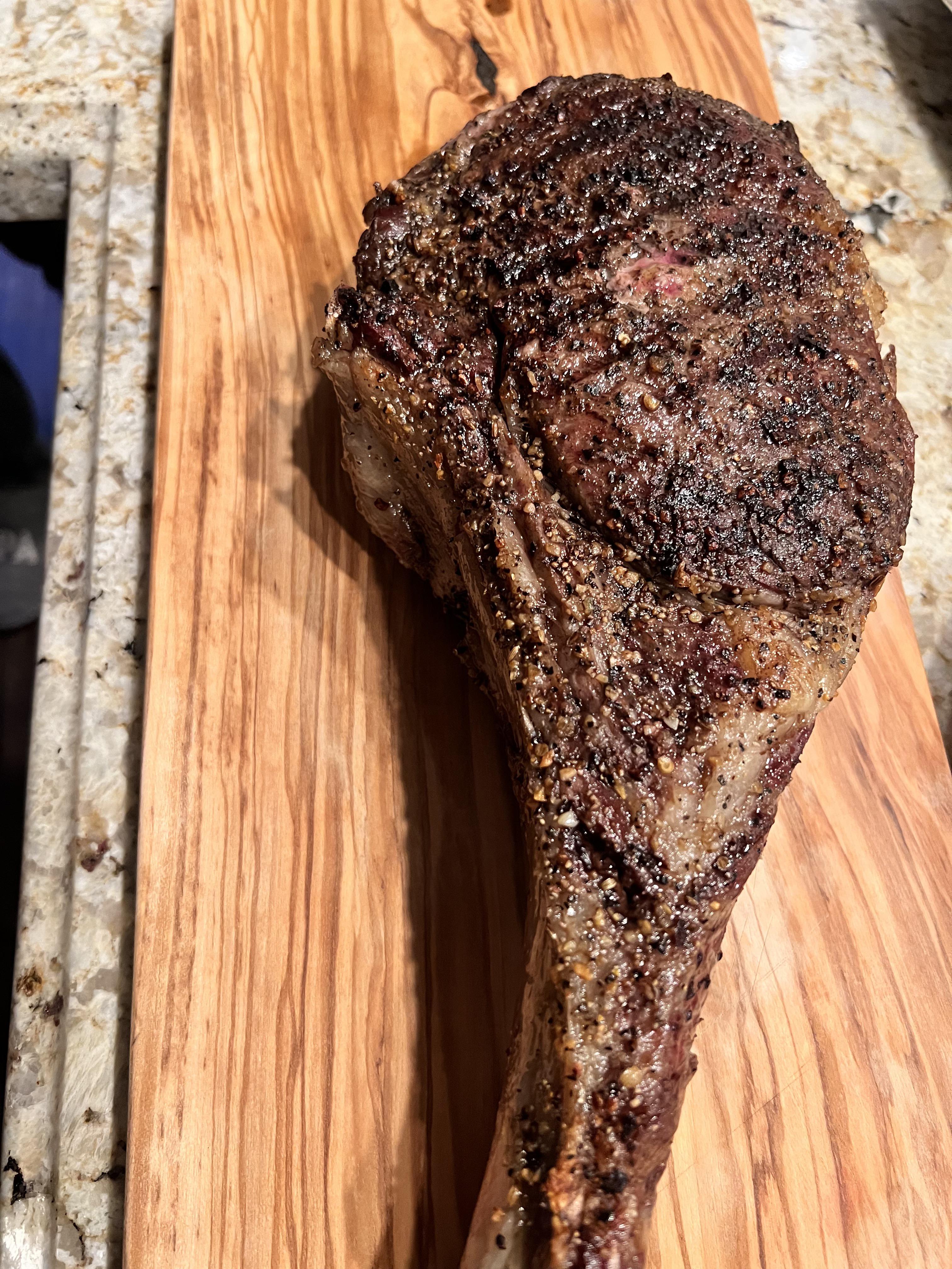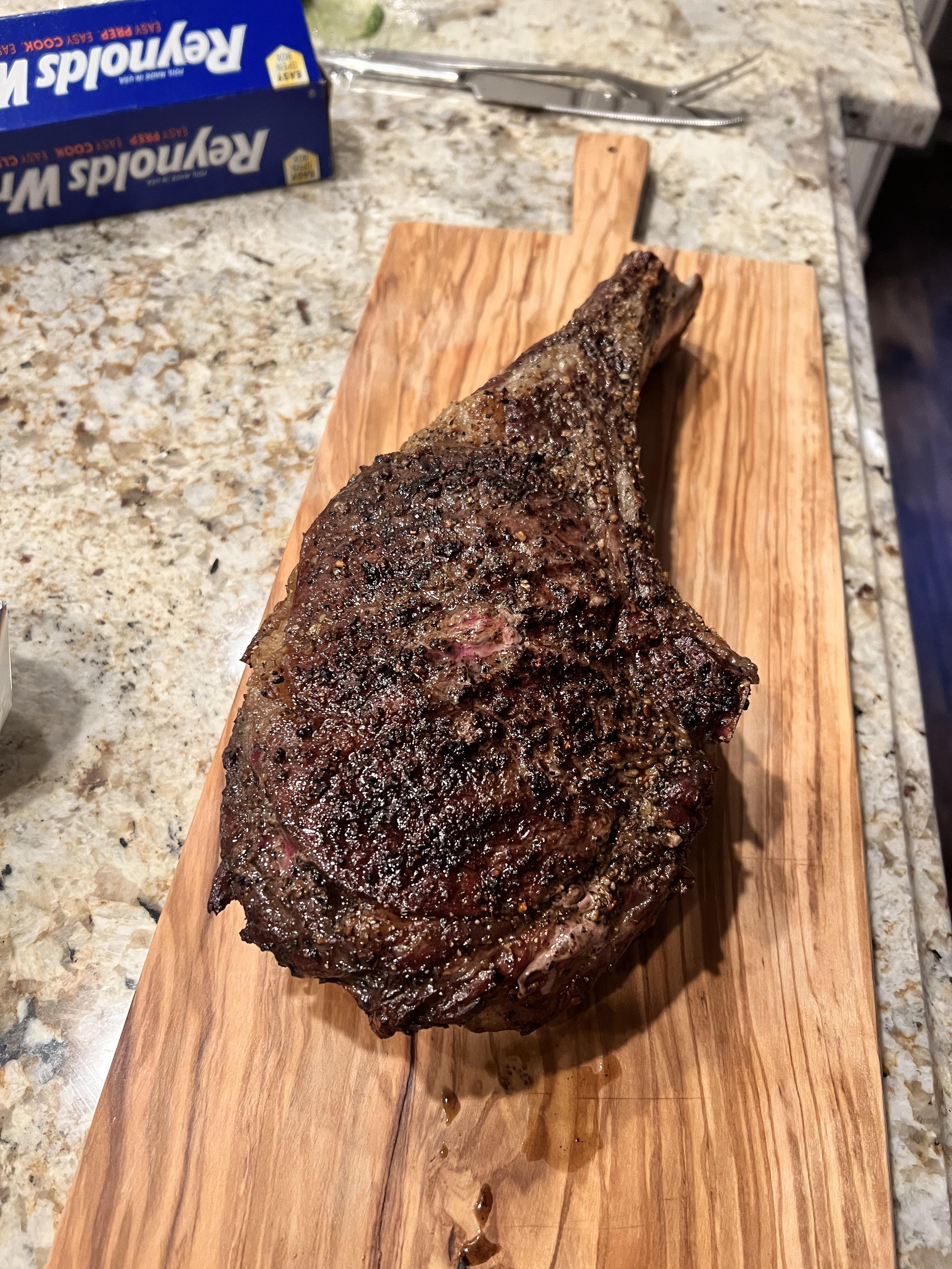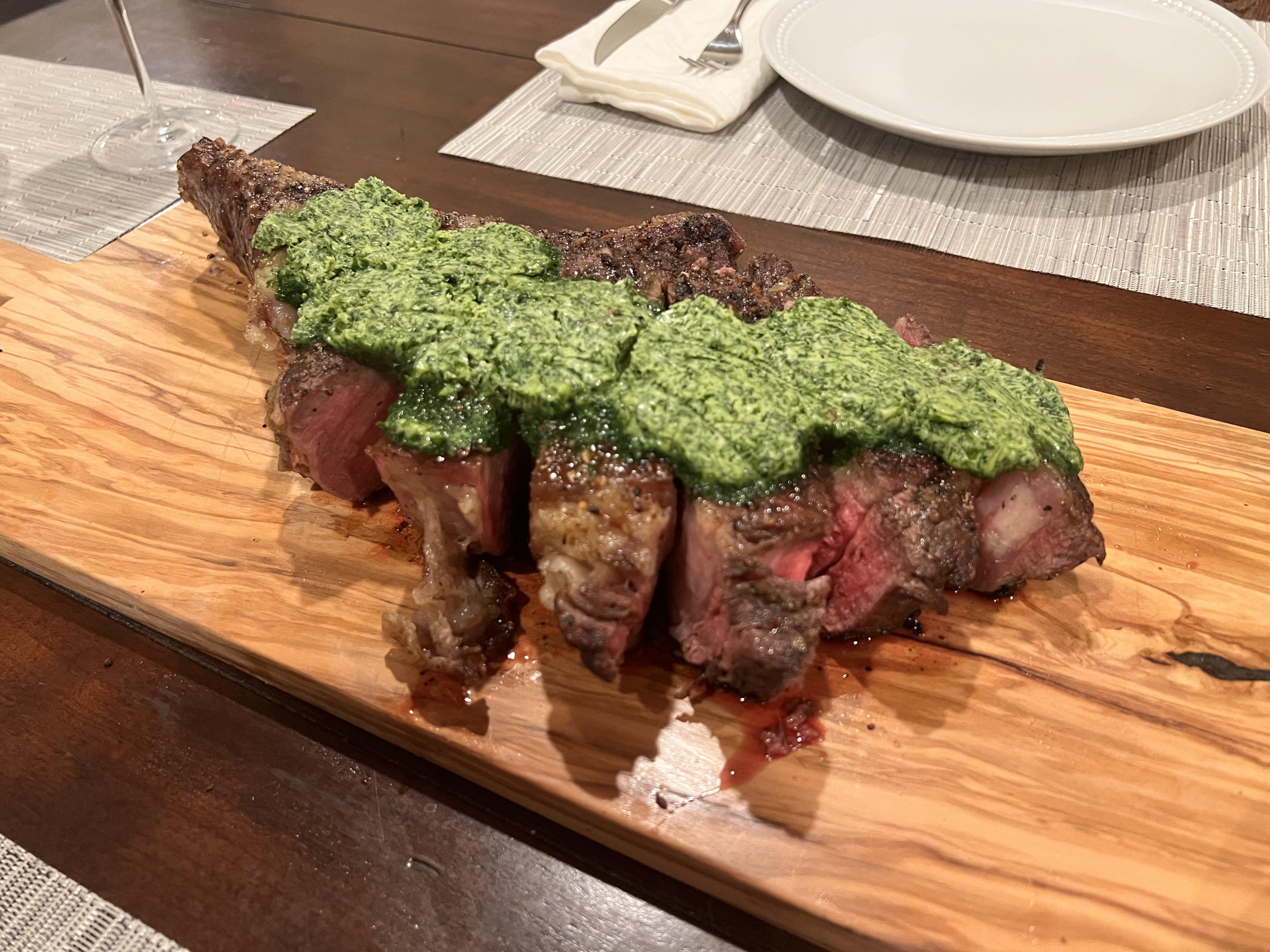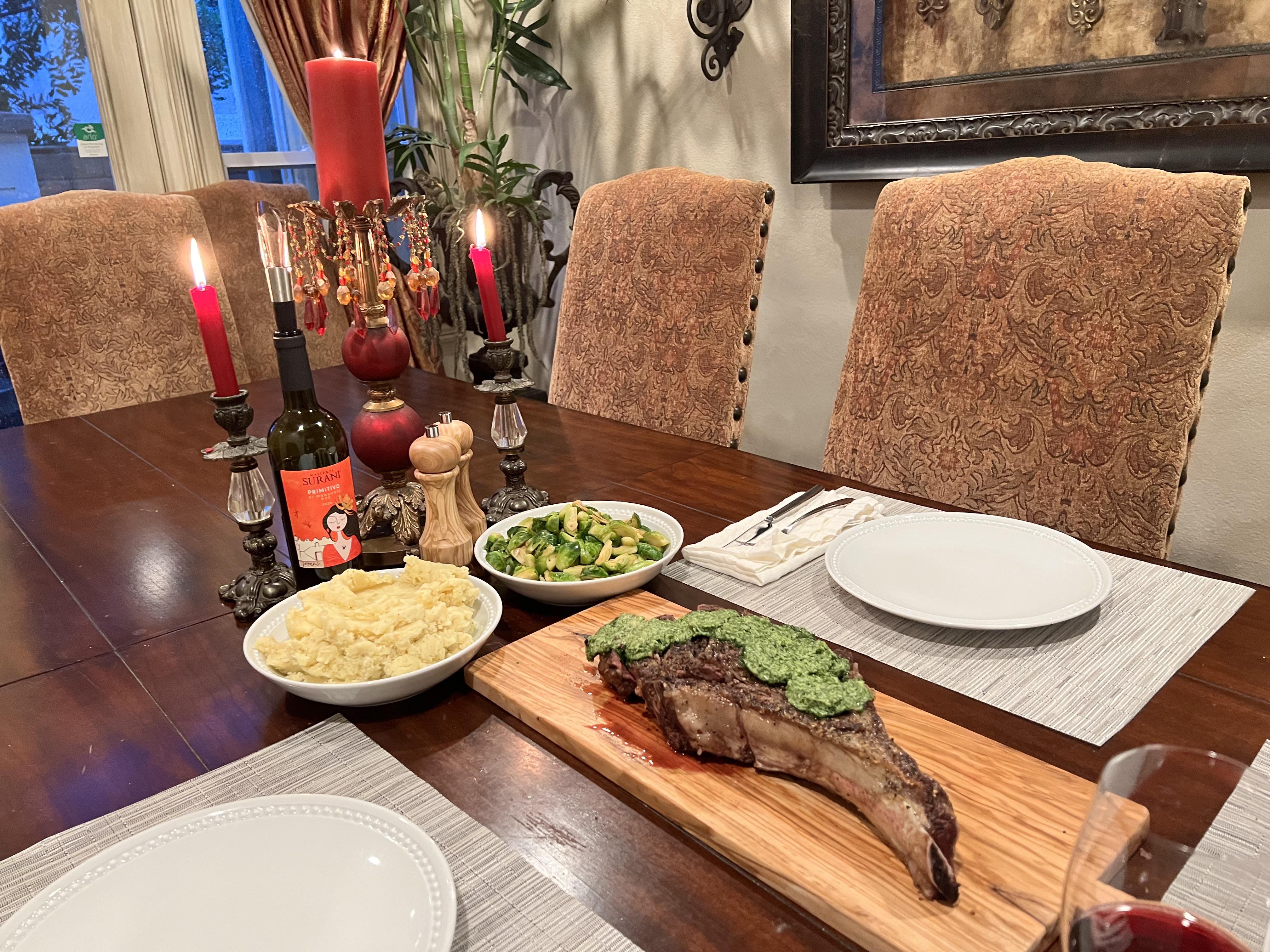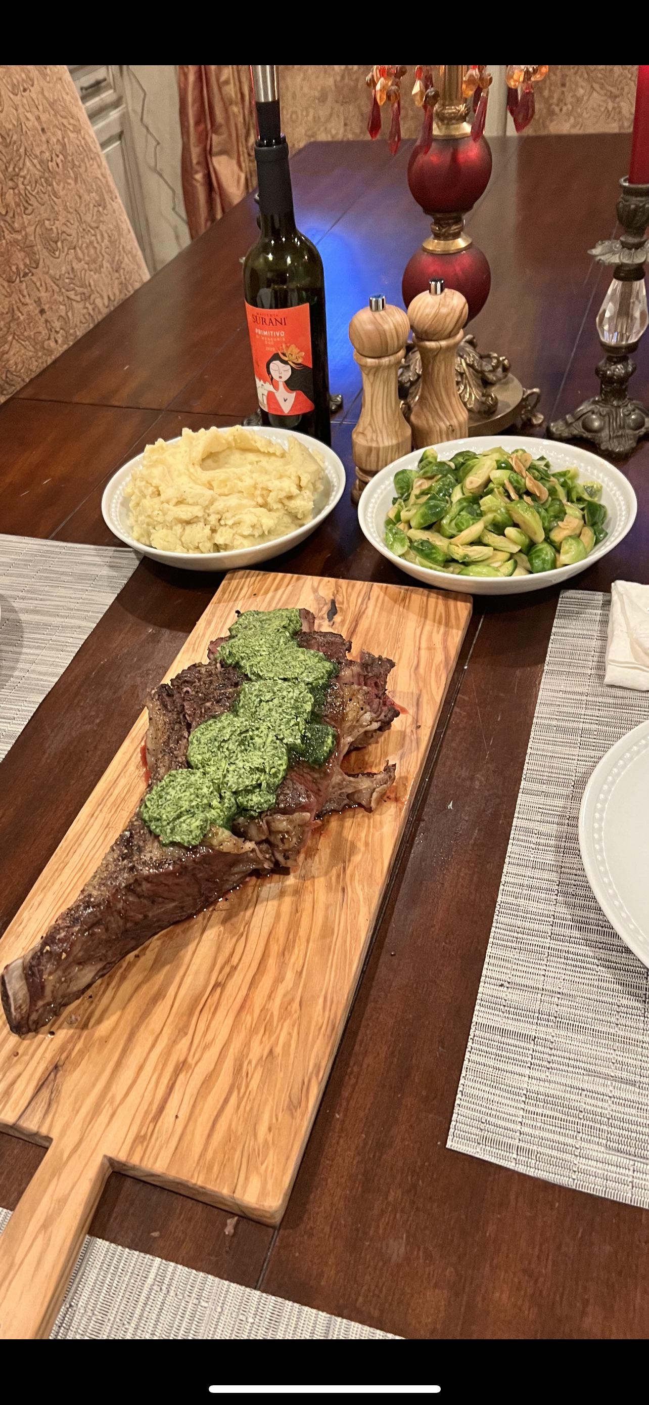 [homemade] Tomahawk steak with chimichurri compound butter, mashed potatoes and brussels sprouts.