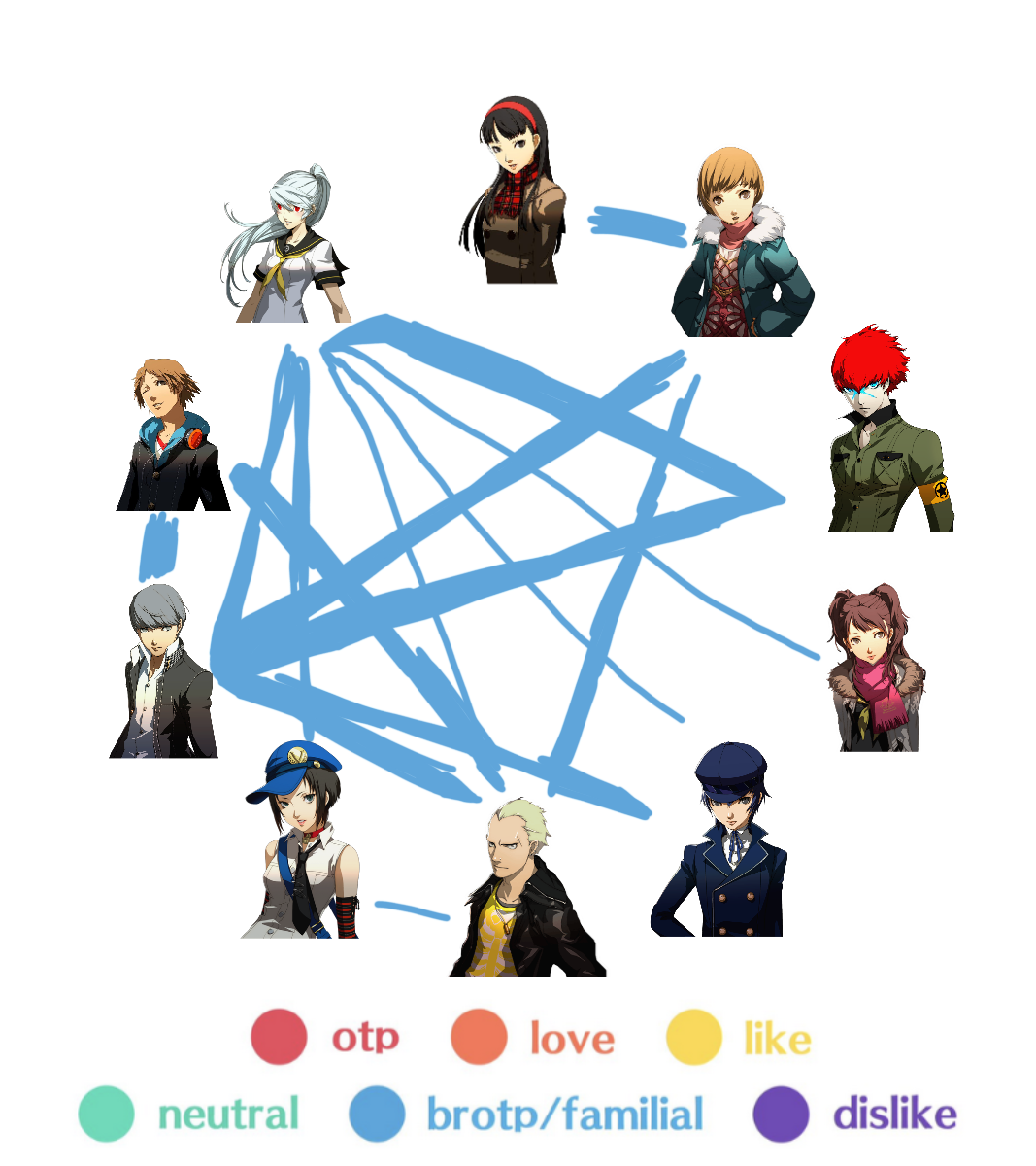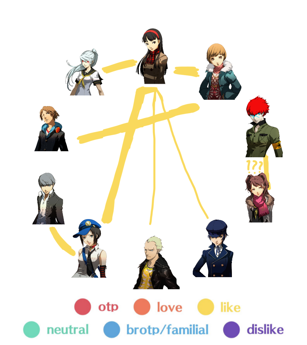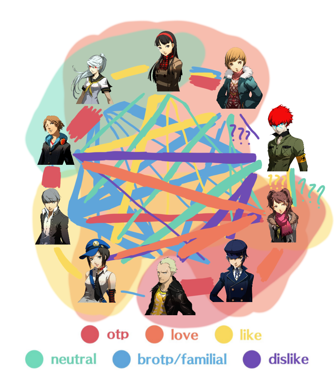 My ship chart showcasing the P4 cast + spinoff characters in a bisexual polycule ship chart (full + individual layers)