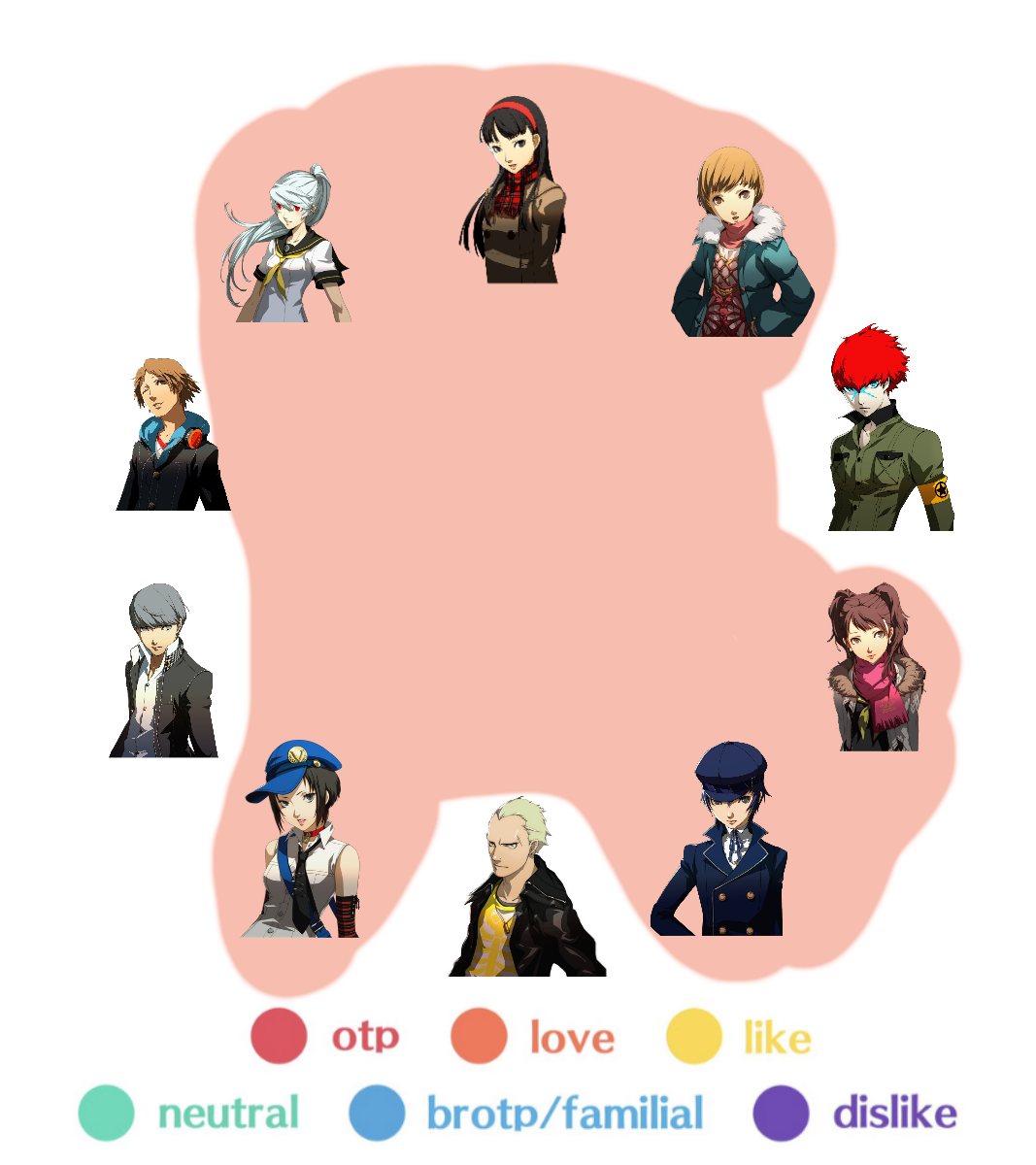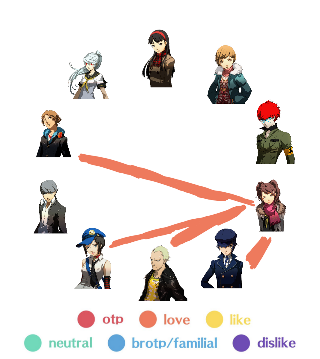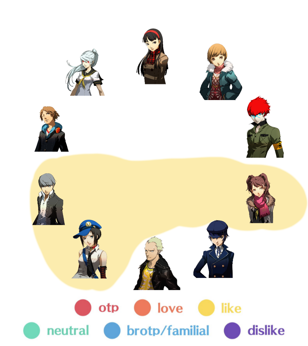 My ship chart showcasing the P4 cast + spinoff characters in a bisexual polycule ship chart (full + individual layers)