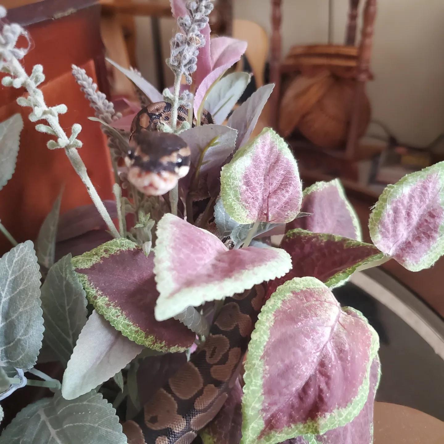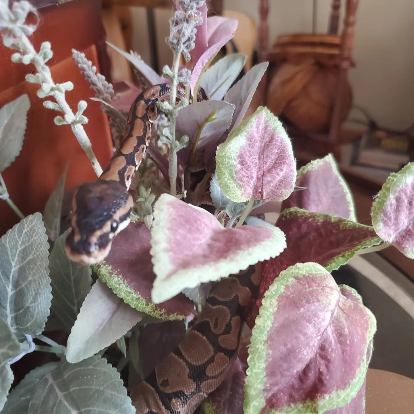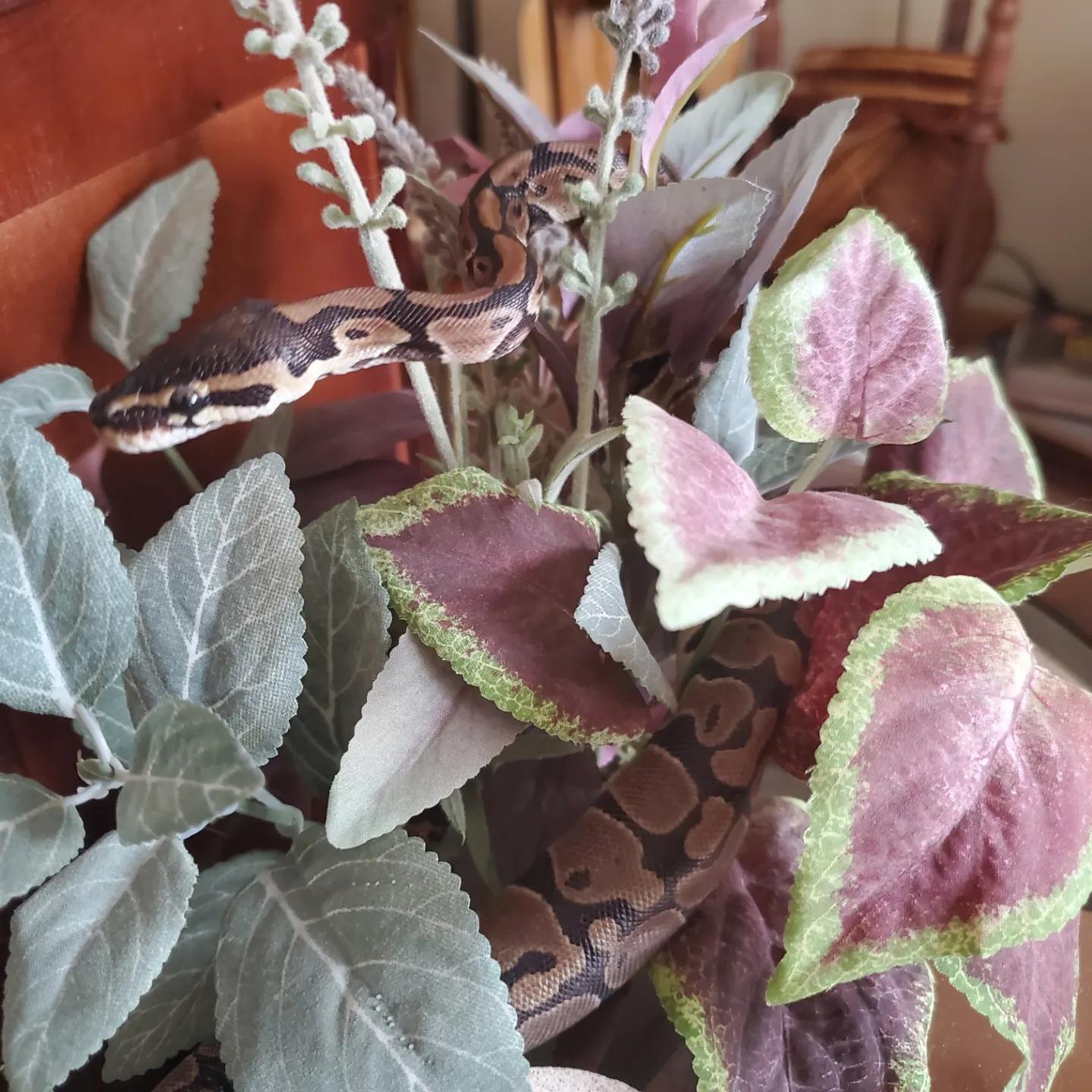 [OC] My ball python, Halli, exploring a fake plant then thanking me