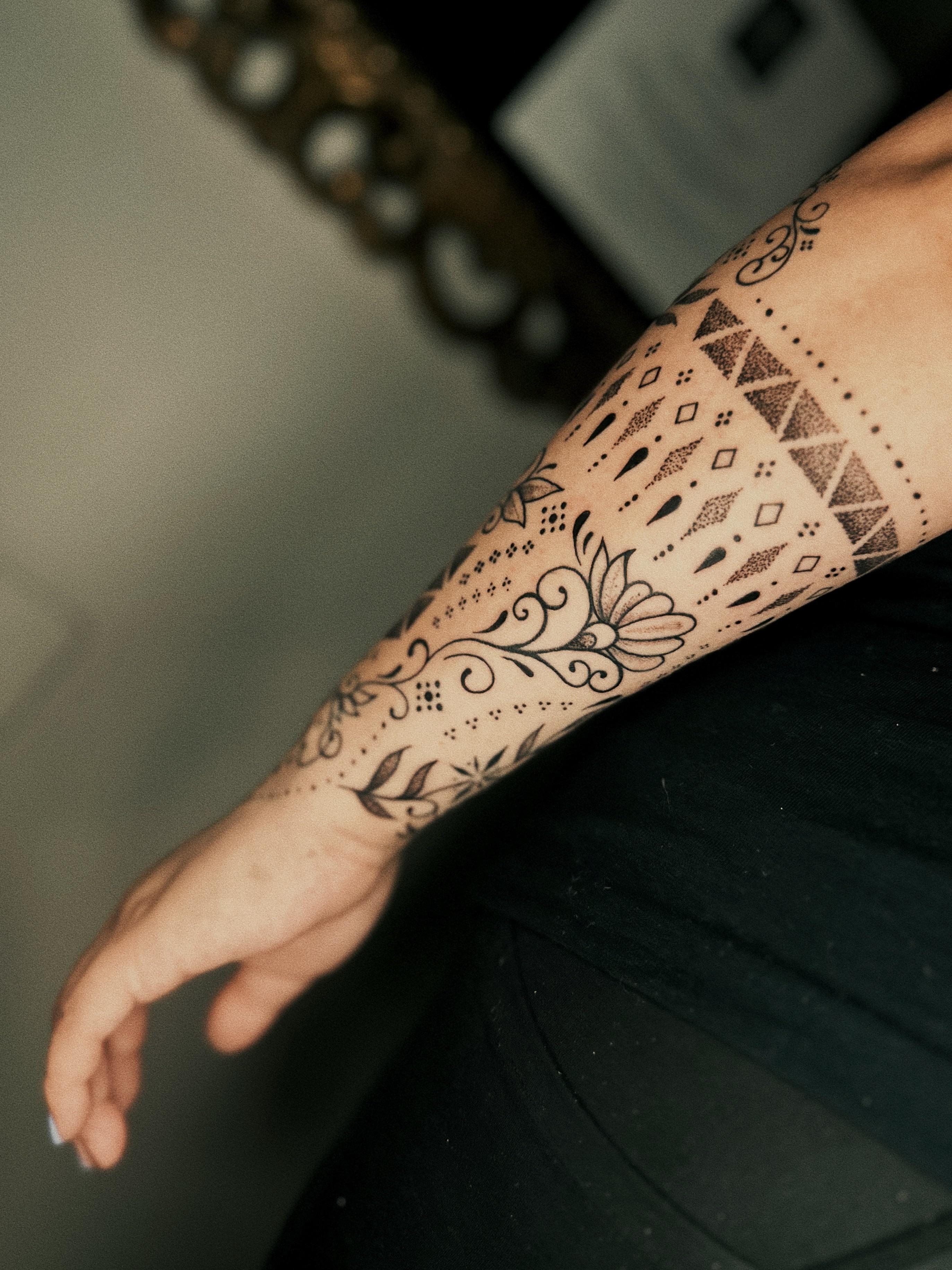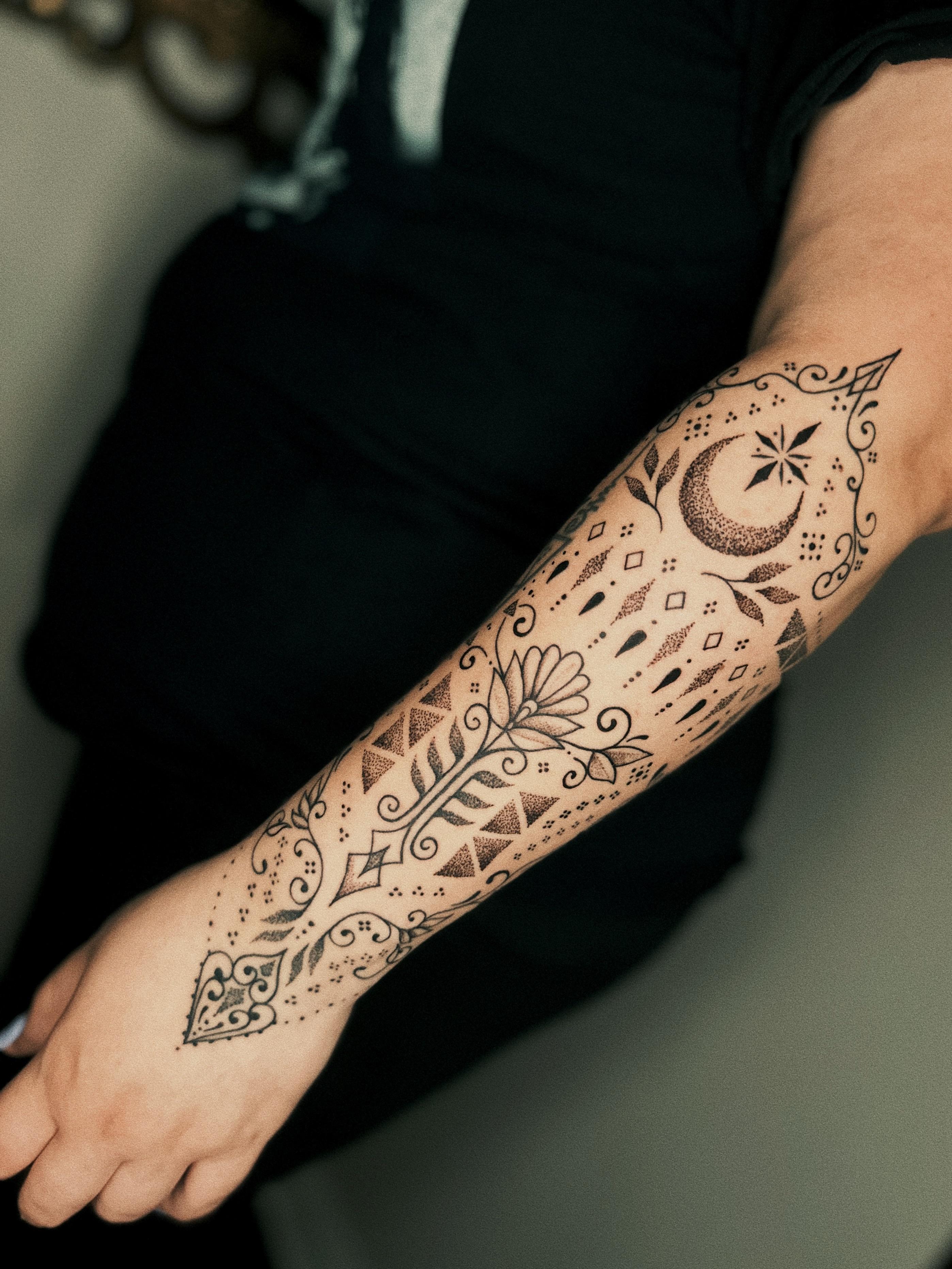 Ornamental dotwork half sleeve by cosmikali, sangoma tattoo San Francisco CA