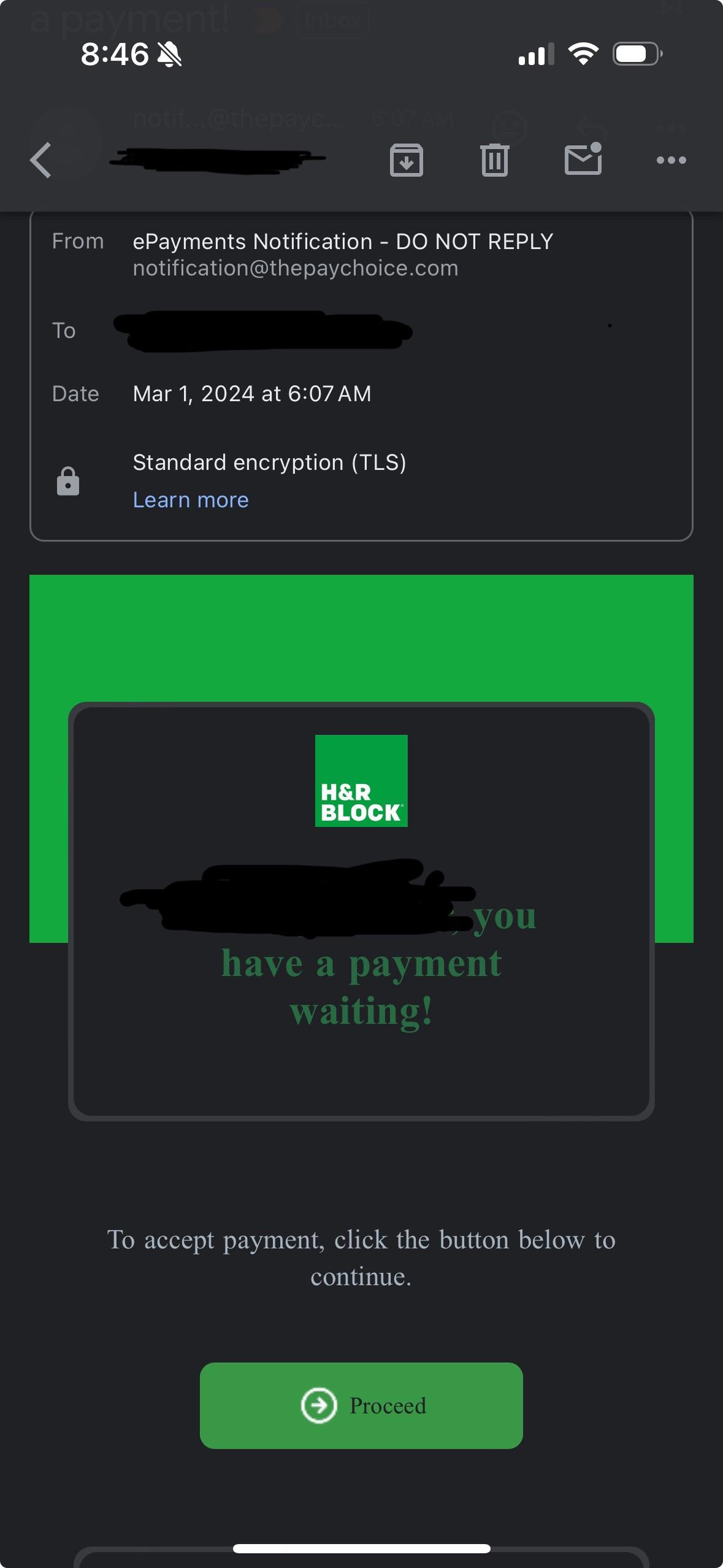 Refund payment from H&R Block through thepaychoice.com?