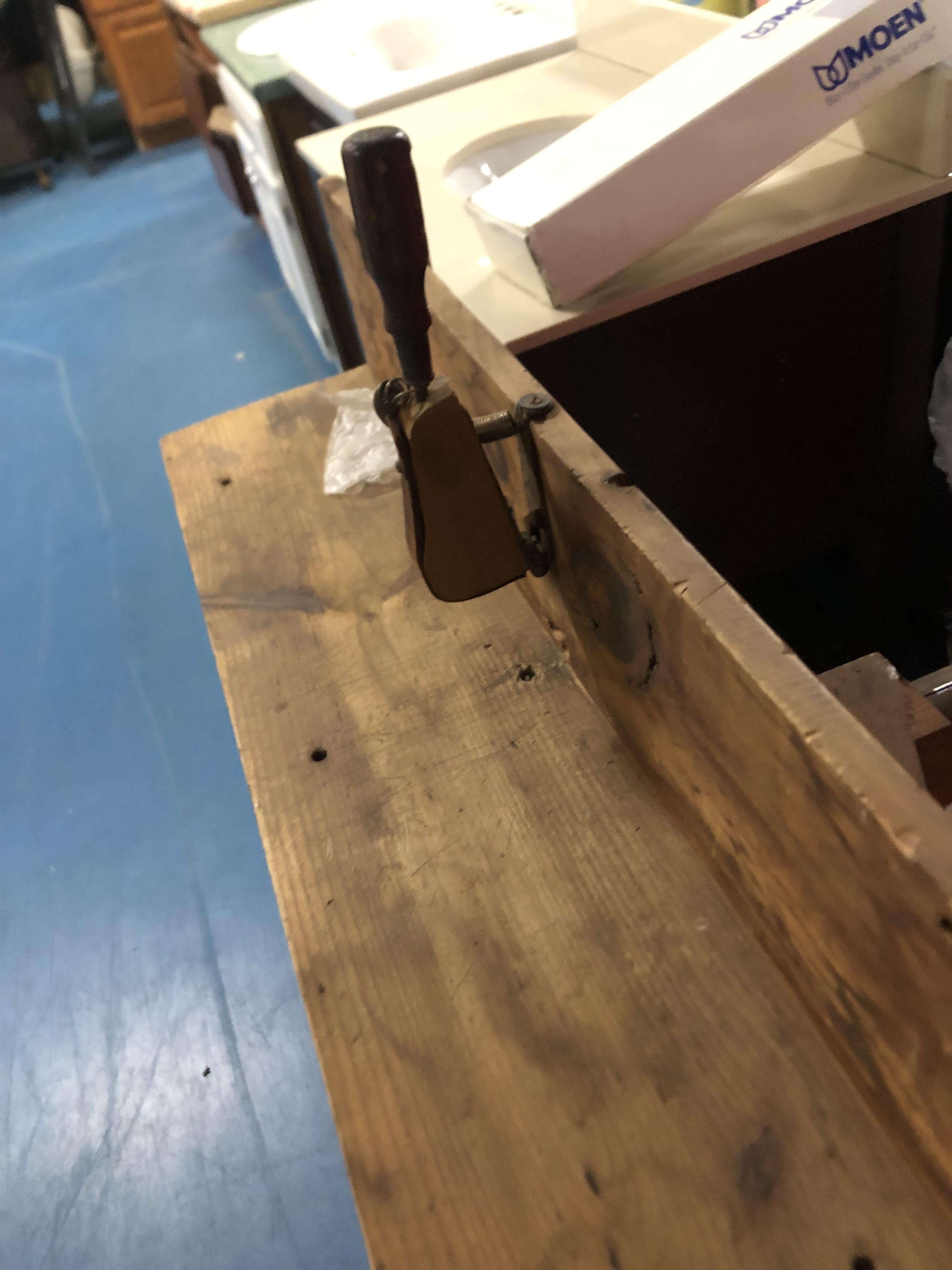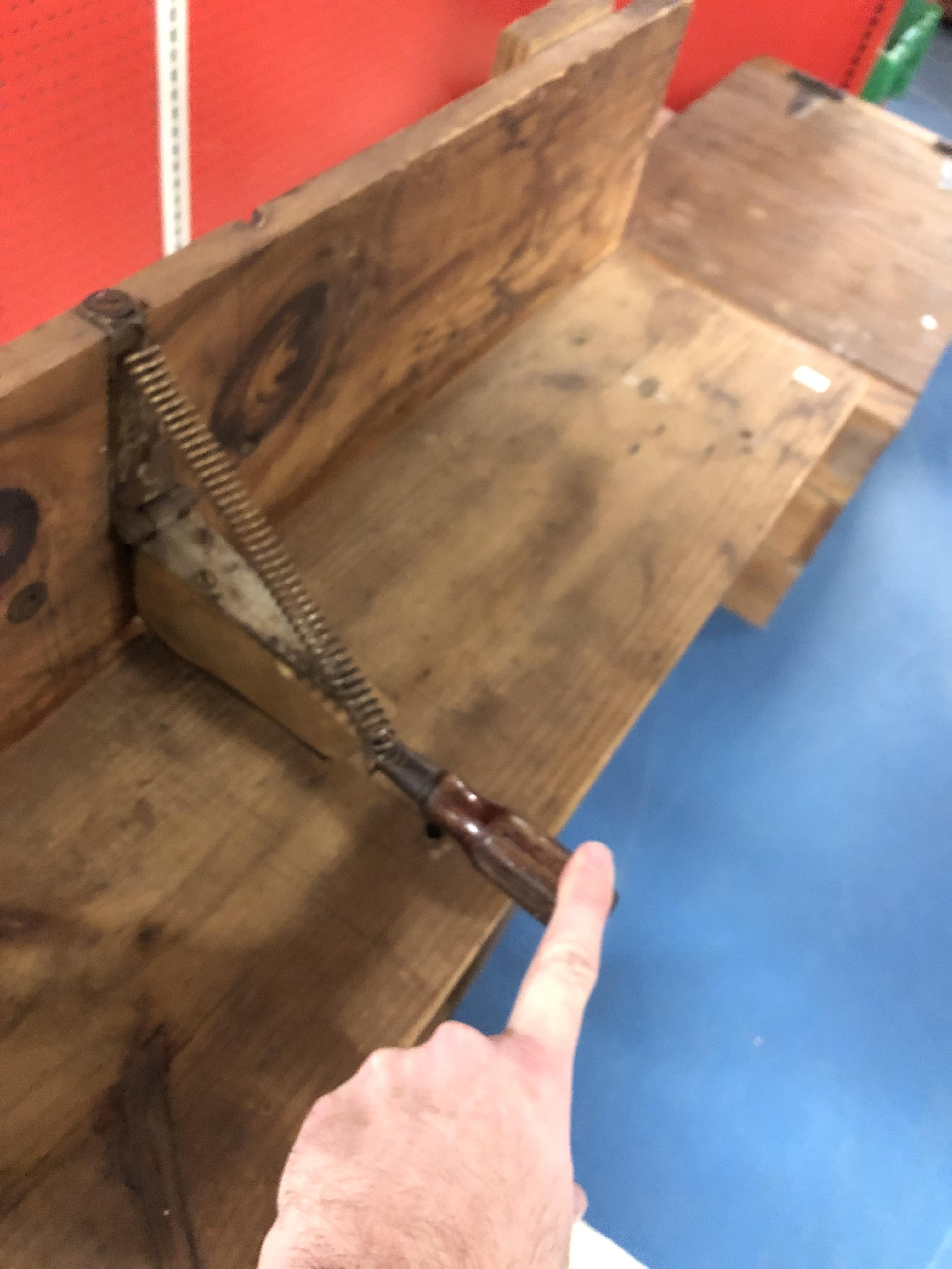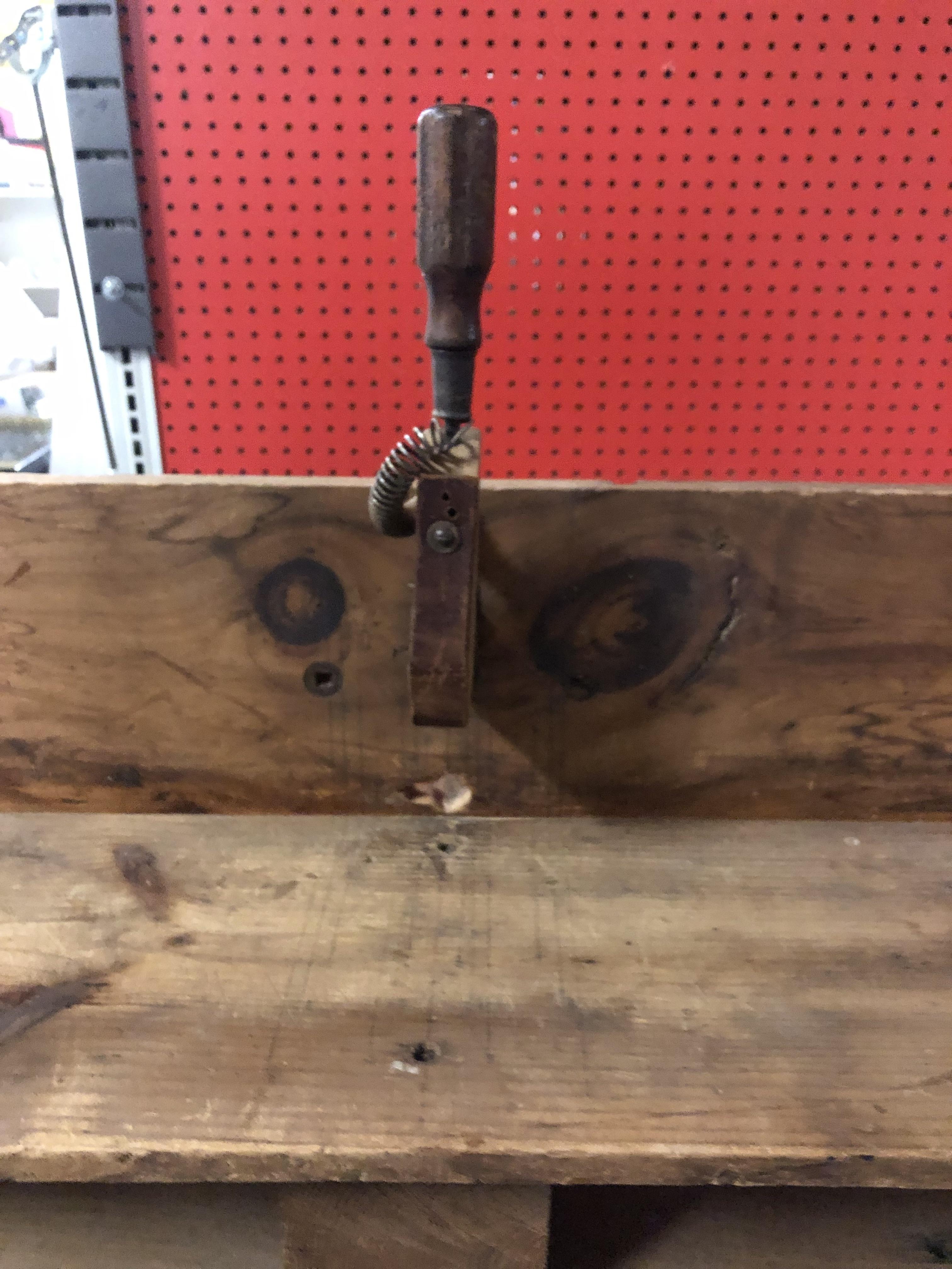 Wood bench with hinged stamping tool. Looks like it was used repetively.